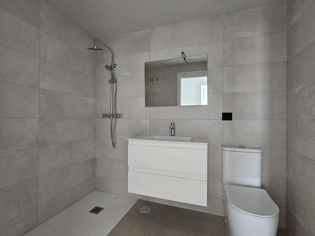 INTERIORES El interior de los áticos está diseñado para ofrecer confort y elegancia. Con una superficie construida de 68 m² y 55 m² útiles, los apartamentos disponen de 2 o 3 dormitorios dobles y 2 baños completos, uno de ellos en suite. El amplio salón se conecta directamente con la terraza, permitiendo una excelente entrada de luz natural. La cocina, integrada en el salón, está equipada con materiales de primera calidad, incluyendo electrodomésticos de alta gama. Los apartamentos cuentan con aire acondicionado y calefacción canalizados, alicatados cerámicos de primera calidad, doble acristalamiento tipo climalit y videoportero, asegurando un ambiente moderno y seguro. Los armarios empotrados y los sanitarios en baños de primeras marcas en color blanco, junto con la grifería cromada, añaden un toque de lujo y funcionalidad.