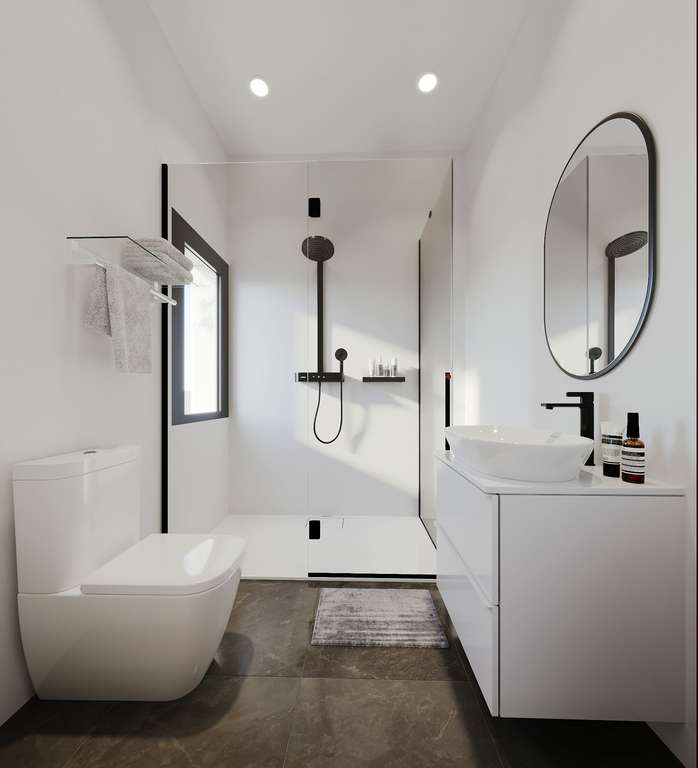 Cada villa cuenta con tres dormitorios equipados con armarios empotrados, proporcionando organización y comodidad. Los tres baños presentan acabados de alta calidad y un diseño contemporáneo que refuerza el carácter exclusivo de la vivienda.