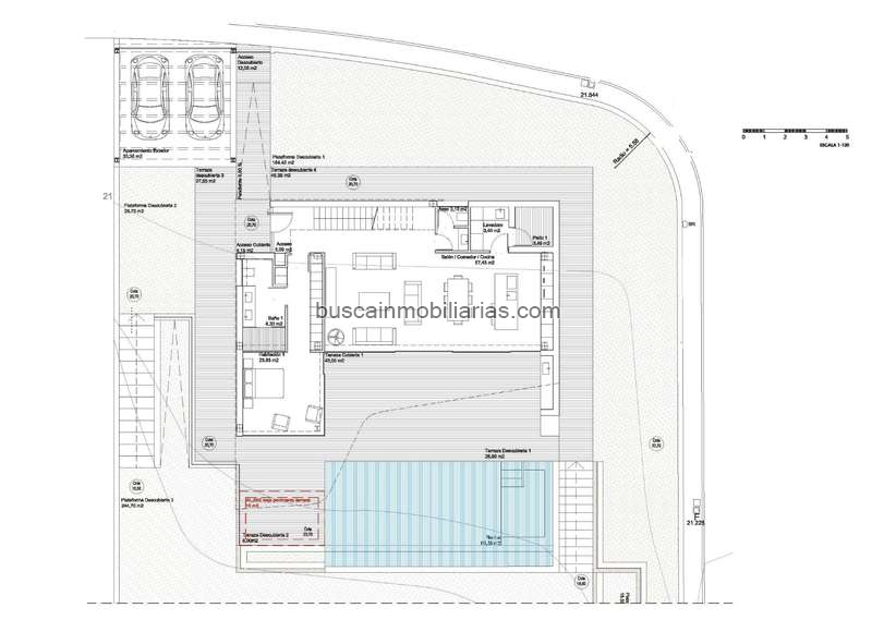 En la planta principal se encuentra la zona de día, formada por un espacioso salón-comedor conectado con la cocina de concepto abierto, equipada con isla central. Desde aquí se accede directamente a la zona exterior. También en esta planta hay un aseo de cortesía, lavadero independiente y un dormitorio adicional con vestidor y baño privado.