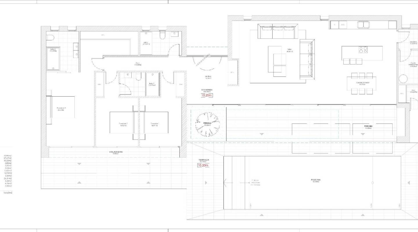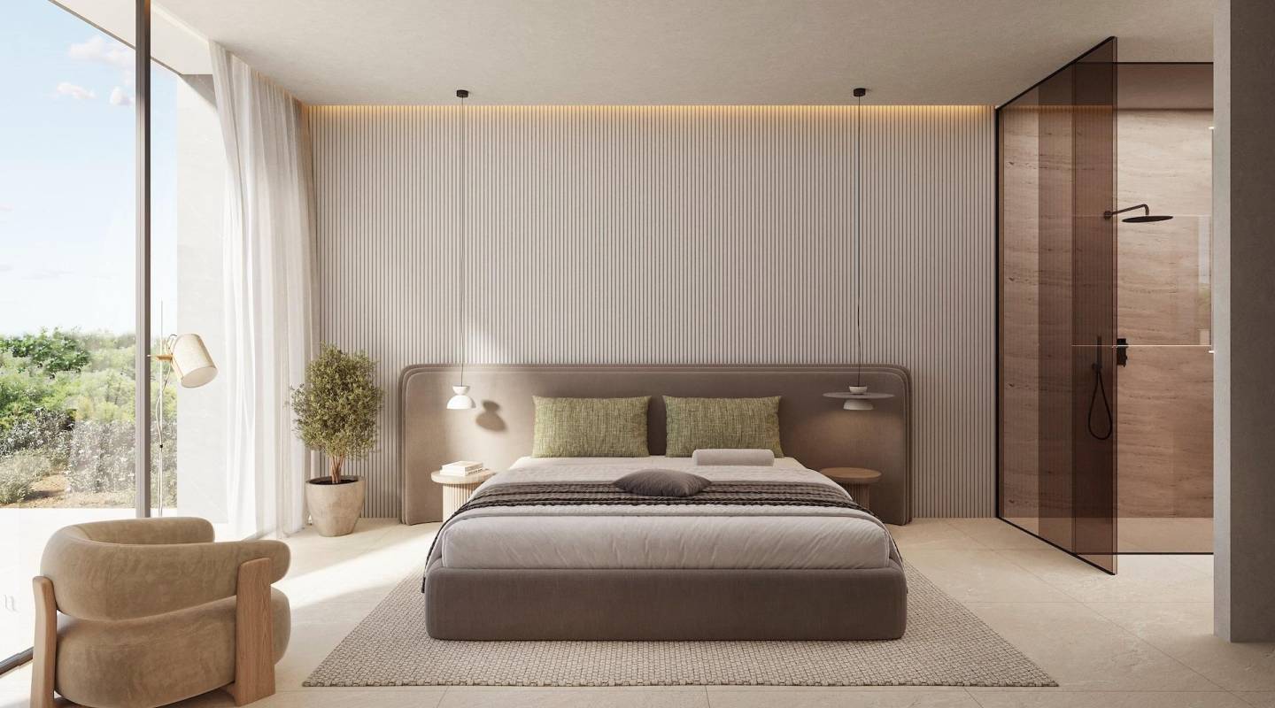 Diseñada para ser práctica y funcional, la villa se distribuye en una sola planta, lo que la hace ideal tanto para familias como para jubilados. La entrada da a un luminoso vestíbulo que se abre a un amplio salón-comedor de planta abierta con una moderna cocina con isla y un lavadero independiente. Grandes puertas correderas conectan el interior con un porche cubierto con barbacoa incorporada, una amplia terraza y una piscina privada de 52 m².