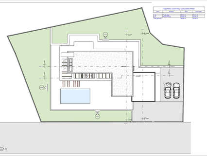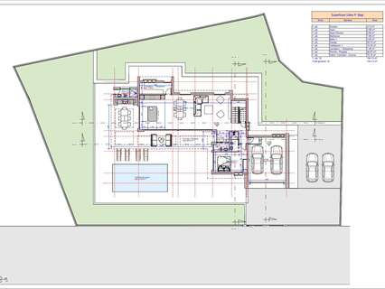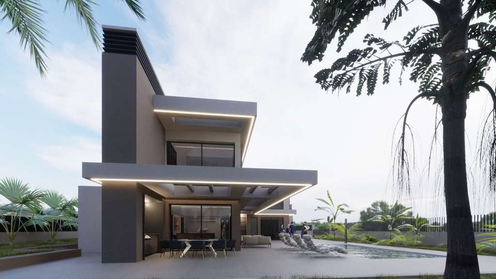 En el exterior hay una amplia terraza cubierta, una terraza solárium alrededor de la piscina y un aseo exterior adicional. La villa también cuenta con un garaje para dos coches. La villa está equipada con calefacción por suelo radiante, aire acondicionado y doble acristalamiento.