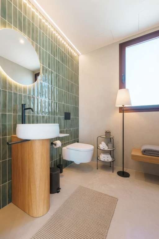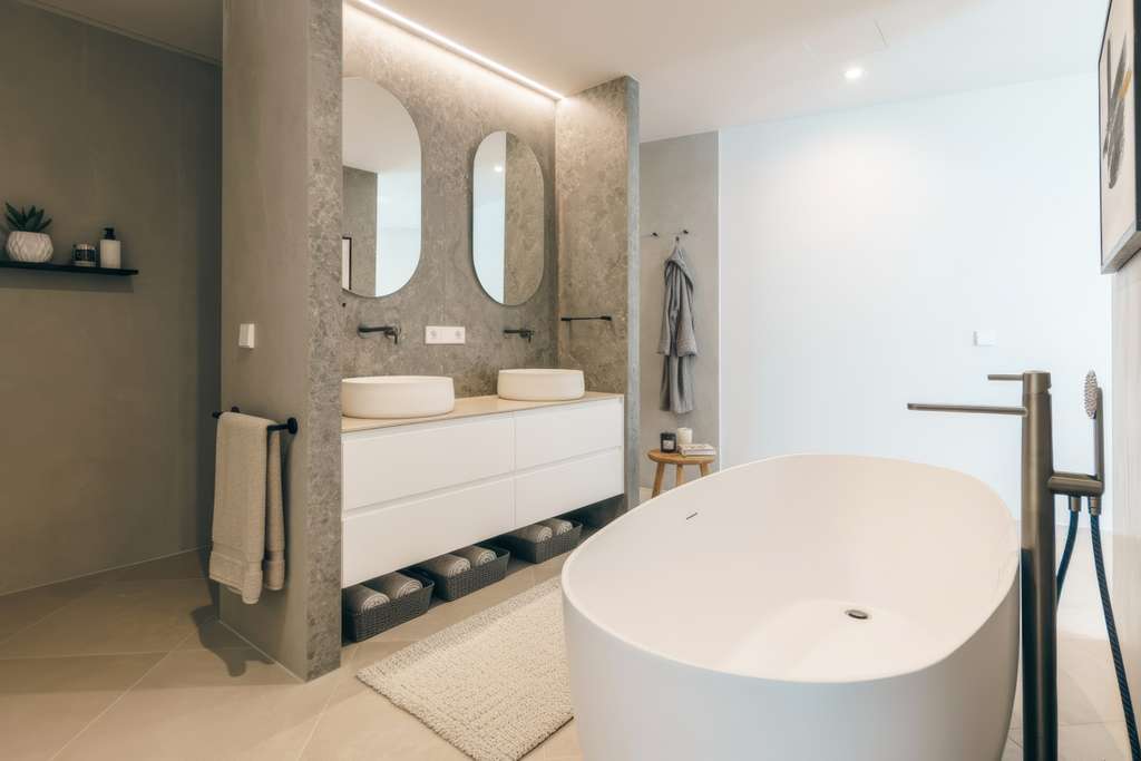 La vivienda dispone de 5 dormitorios en suite y 6 baños con materiales en tonos piedra, iluminación ambiental y duchas walk-in. La suite principal incluye bañera independiente y doble lavabo.