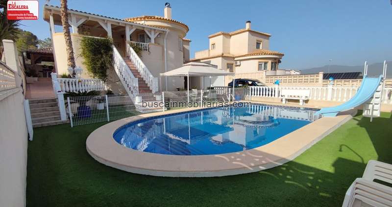 Ref. 4517 - En venta chalet villa amueblado con piscina. Ubicada en el centro de la urbanización de Castalla Internacional, con parcela de unos 530 m2, linda al frente una de las calles más anchas de la urbanización y a la trasera con zona verde. La vivienda consta de 96m2 en una sóla planta y 34 m2 de uso deportivo. En planta baja hay un trastero-garaje de 125m2 con muchas posibilidades. La vivienda dispone de comedor con chimenea nueva, amplia cocina con electrodomésticos nuevos. Habitación de matrimonio con baño completo, cuenta con bañera y 2 amplias habitaciones más. Todas las habitaciones tienen armario empotrado. Baño con ducha y mámpara. Tercer aseo para servicio de zonas de exterior. Solárium.