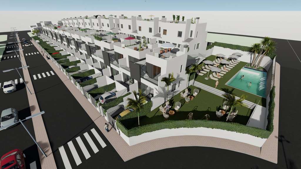 Descubra una nueva promoción residencial de 44 modernos adosados en Cox, Alicante. Estas casas están disponibles en 2 y 3 dormitorios, cada uno con un solarium privado, terrazas, patios y aparcamiento privado. La comunidad ofrece acceso a zonas comunes, incluyendo una piscina comunitaria, creando un ambiente ideal para relajarse.