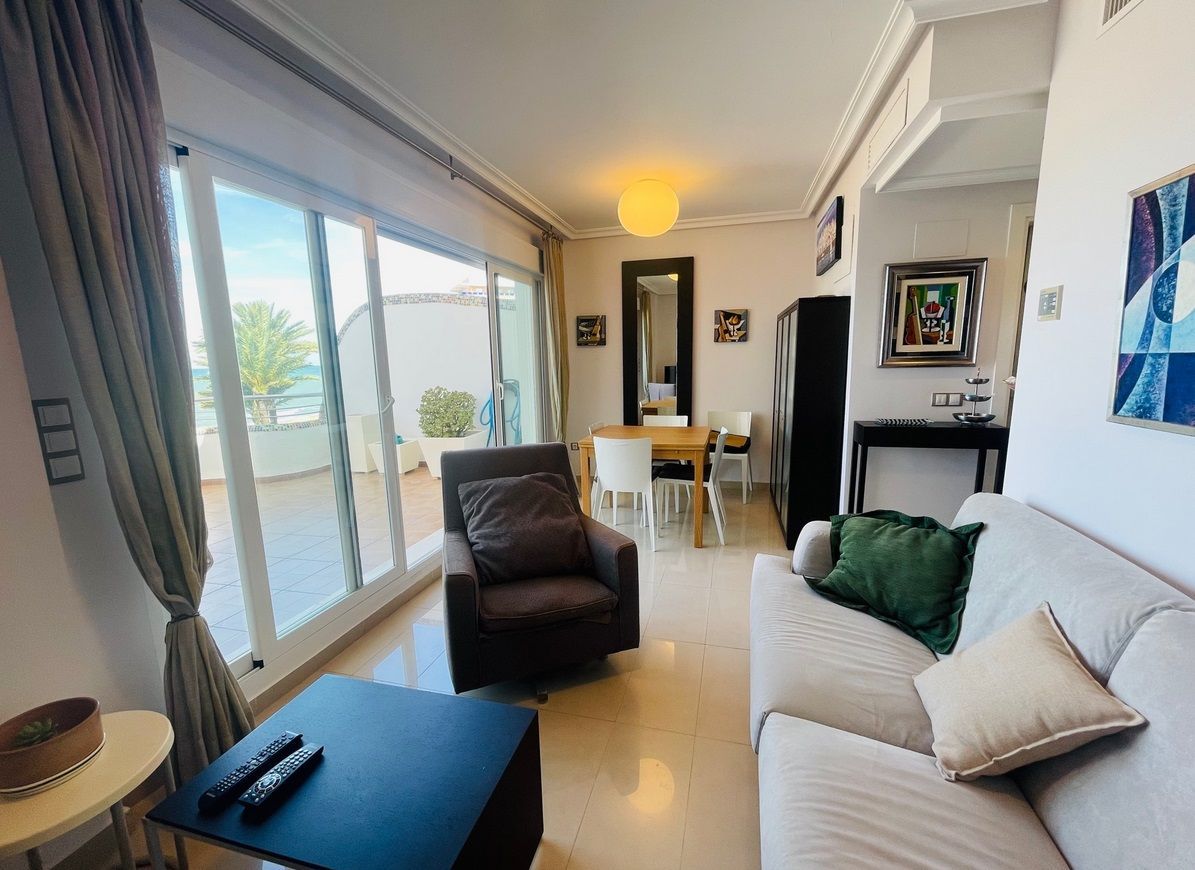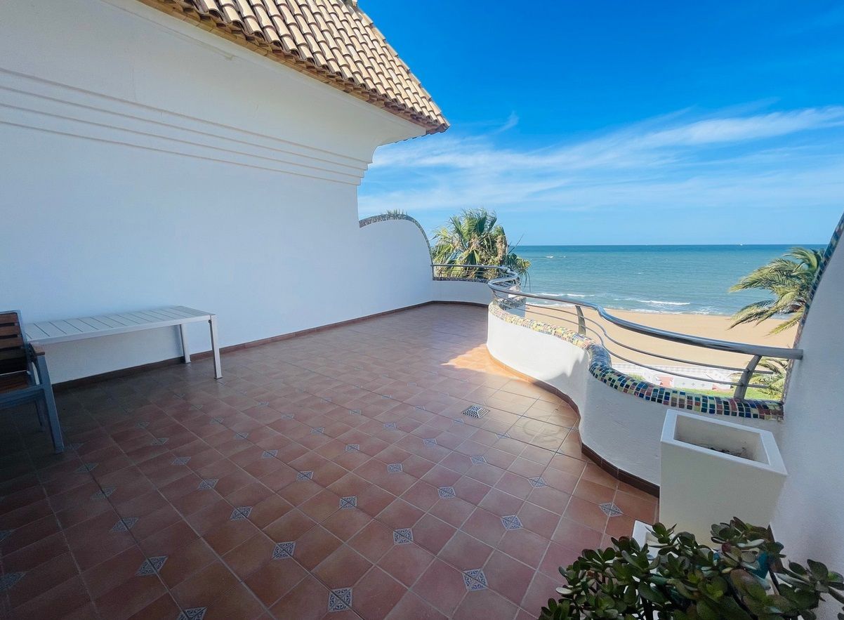 Ático dúplex en 1-ra línea de playa, Las Marinas km4. Vivienda con increíbles vistas al mar, situada en 3ra planta con ascensor. Esa construida en dos alturas y su distribución es la siguiente: la planta baja cuenta con salón-comedor con acceso a una terraza de 40m2, cocina con acceso a zona de cuarto de lavandería y un baño con ducha. La planta alta se compone de dos dormitorios con armarios empotrados y un baño con ducha. Dispone de aire acondicionado, doble acristalamiento, trastero y dos plazas de garaje incluidas en el precio. Urbanización con acceso directo a la playa, amplias zonas verdes y piscina comunitaria. A un paso de todos los servicios, así como del centro urbano de Denia.