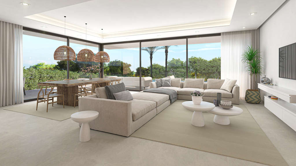 La piscina infinity y el cuidado jardín mediterráneo se integran de manera fluida, creando un entorno visualmente impactante. Con cuatro dormitorios y cuatro baños distribuidos en dos plantas, la villa ofrece un espacio lujoso y funcional para la vida cotidiana.