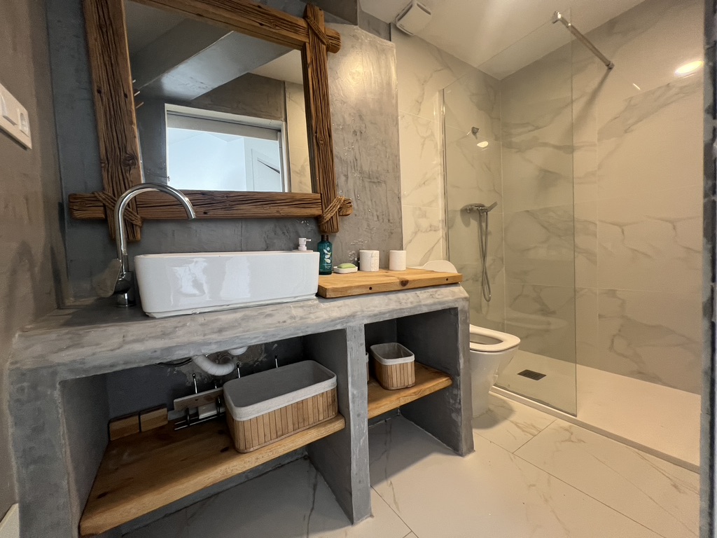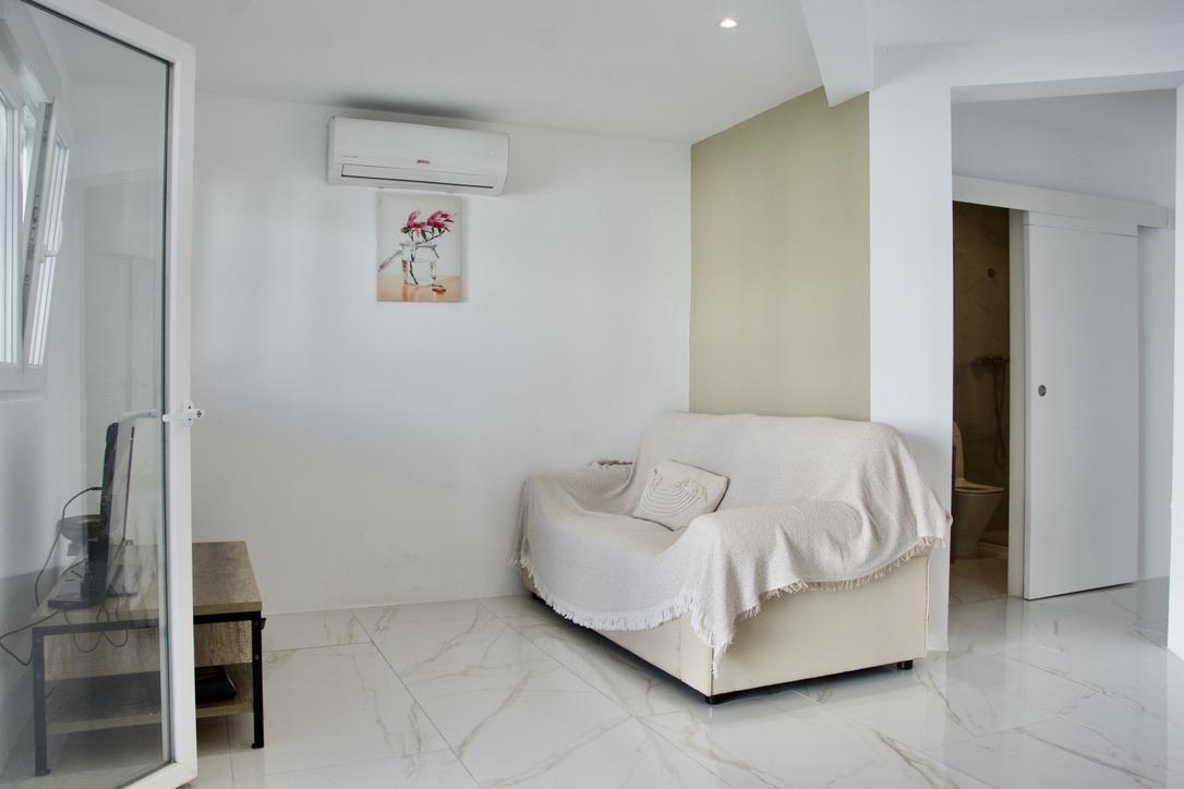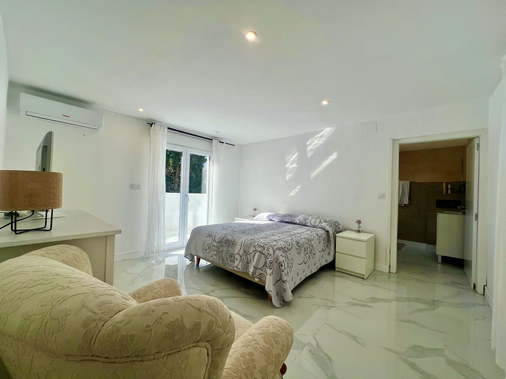 El apartamento independiente, perfecto para invitados o para alquiler vacacional, dispone de un salón con cocina abierta, dos dormitorios y un baño, además de acceso directo a la piscina y a la terraza cubierta, equipada con cocina de verano y barbacoa.