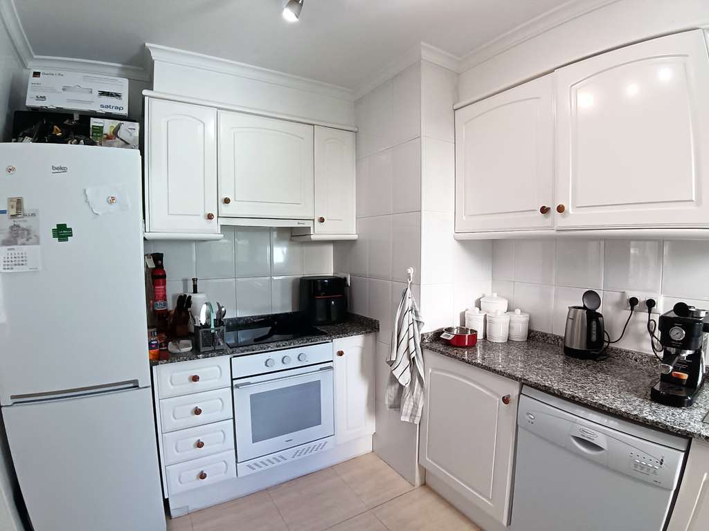 En la planta baja, un amplio recibidor da paso a un luminoso espacio diáfano que integra salón y cocina. El salón-comedor cuenta con chimenea y aire acondicionado frío/calor para disfrutar de una temperatura agradable durante todo el año. La cocina, contigua a la vivienda, está totalmente equipada con vitrocerámica, horno eléctrico, lavavajillas integrado, frigorífico-congelador y amplio espacio de almacenamiento en armarios de madera blanca. Grandes puertas correderas conectan el interior con una terraza cubierta con vistas al jardín, que ofrece un agradable espacio a la sombra para comer al aire libre.