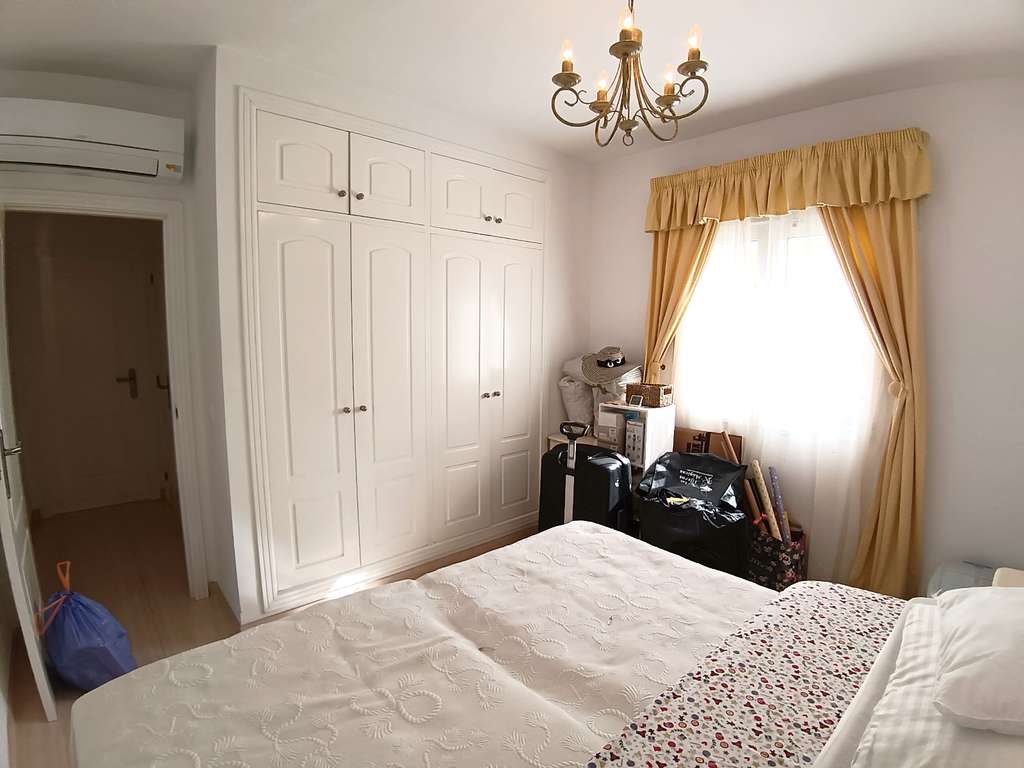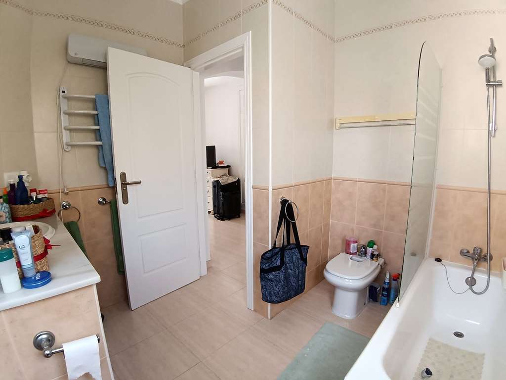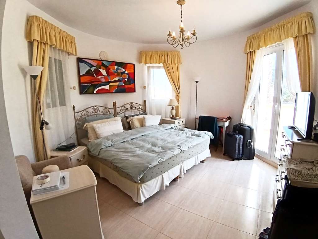 Una escalera de mármol conduce a la planta superior, donde se encuentra el dormitorio principal. Esta espaciosa habitación, con armarios empotrados, dispone de baño privado con bañera y acceso a la terraza de la azotea, con vistas panorámicas al entorno natural y a la sierra del Montgó.