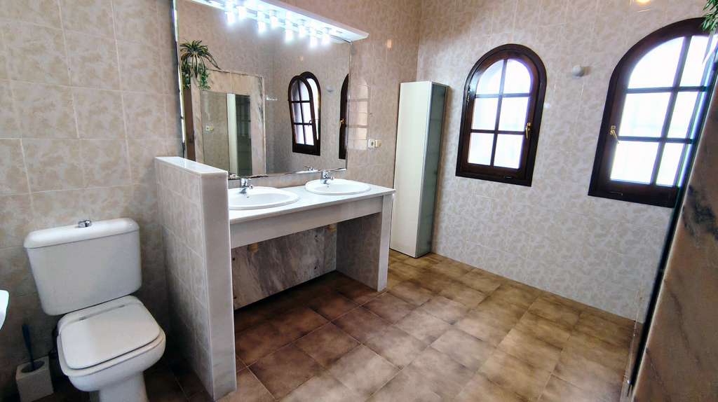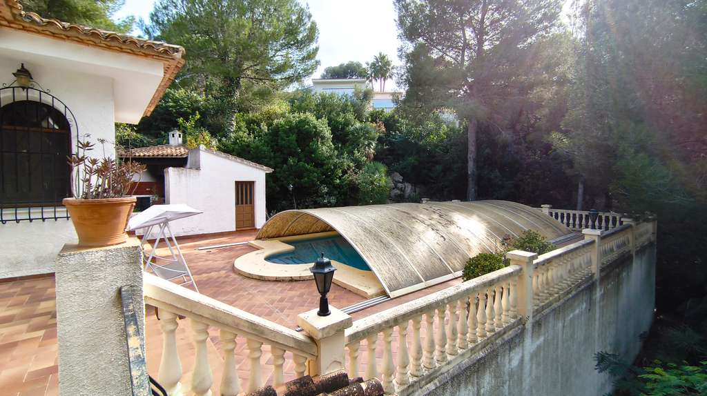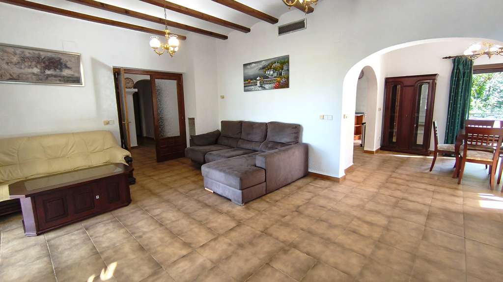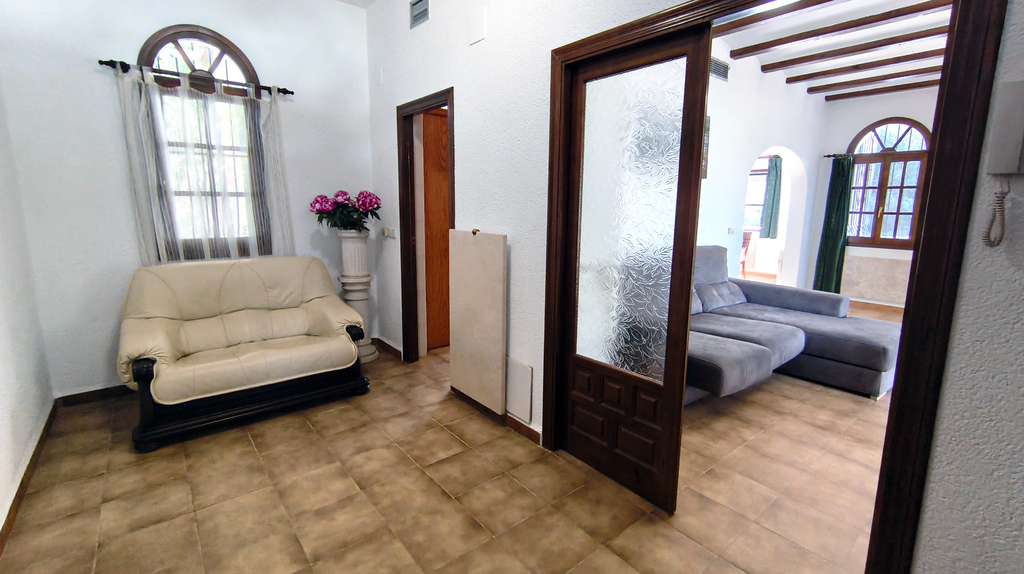 Esta villa tradicional de estilo mediterráneo, con cinco dormitorios, está rodeada de exuberantes jardines en el corazón de La Sella. Construida en 1991 sobre una amplia parcela, conserva sus acabados originales y rebosa de auténtico carácter español, incluyendo armarios empotrados de madera castellanos y accesorios clásicos en toda la vivienda. Una amplia rampa de acceso conduce a la cochera doble situada al pie de la propiedad. En el interior, la planta principal ofrece espacios amplios y luminosos, con el salón, el comedor y la cocina integrados de forma fluida. Tanto la cocina como el comedor se abren a la zona de barbacoa y a la cocina de verano, perfectamente ubicadas junto a la gran piscina y la terraza.