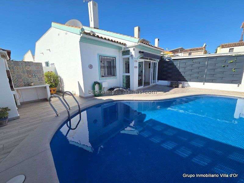 La parcela de 200 m² dispone de una piscina privada, zona de aparcamiento y se ubica en una calle muy tranquila y sin salida.