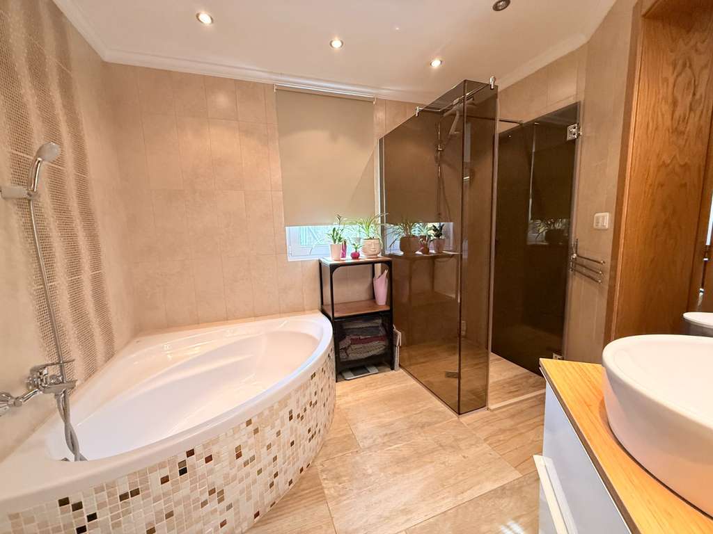Baño completo con grandes dimensiones, con ducha , bañera y doble lavabo.