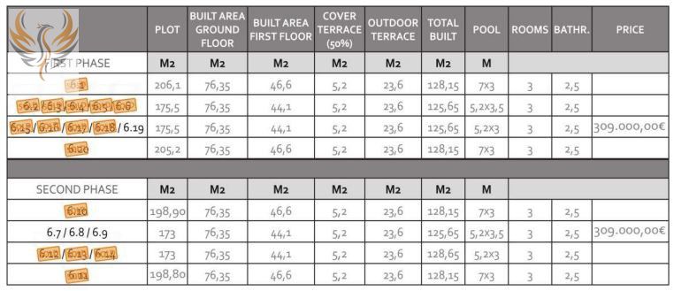 Villa 6.19 con 175,5 m2 de Parcela. 76,35 m2 Construidos Planta Principal. 44,1 m2 Construidos Primera Planta. La Terraza Cubierta (50%) tiene 5,2 m2. Terraza Abierta 23,6 m2. Total Construido 125,65 m2 con un Total de 3 Dormitorios, 2 Baños y 1 Aseo. Piscina 5,2x3. Precio: 309.000 €