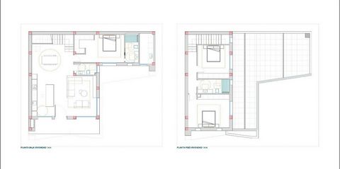 En la primera planta hay dos dormitorios adicionales, un cuarto de baño y acceso a una gran terraza abierta de 60 m2, perfecta para tomar el sol o relajarse mientras se disfruta del clima mediterráneo. Cada vivienda incluye aparcamiento privado dentro de la parcela.