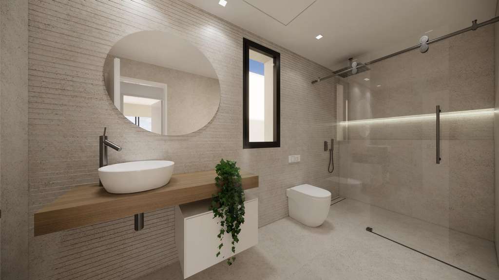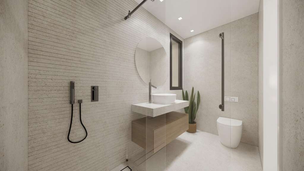 En la planta superior, dos dormitorios adicionales y un baño completo proporcionan comodidad a la familia y a los invitados. Una gran terraza abierta completa este nivel, ideal para disfrutar del clima mediterráneo durante todo el año.