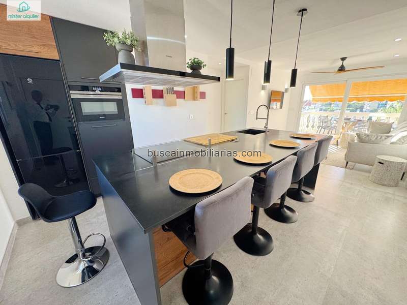 La vivienda dispone de dos habitaciones exteriores muy luminosas: el dormitorio principal, con una amplia cama de matrimonio, y un segundo dormitorio con dos camas individuales. Ambas estancias están perfectamente acondicionadas para garantizar comodidad y descanso. El salón, amplio y elegante, cuenta con aire acondicionado y se integra de forma abierta con una moderna cocina americana en isla.