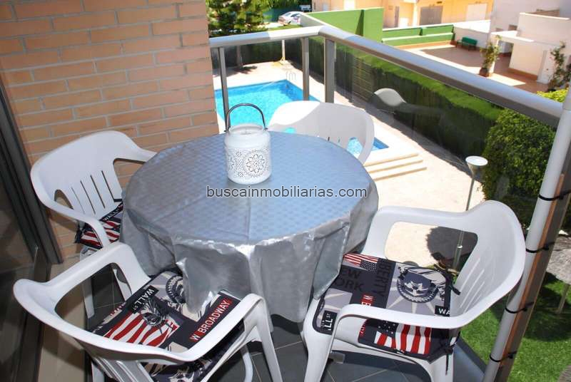 habitación de matrimonio 150, con TV, habitación con 2 camas de 90, salón con sofa de relax, TV, 6¨, mesa comedor grande con 6 sillas; cocina totalmente amueblada (horno, microondas, cafetera dolce gusto, lavavajillas, lavadora, frigorífico, vitrocerámica, batidora, tostador y menaje de cocina); un baño con plato de ducha, terraza con mesa y sillas con vistas a la piscina, y sombrilla para la playa, aire acondicionado (frío/calor) por conductos en todo el apartamento. El alojamiento tiene todas las comodidades y necesidades de confort, plaza de garaje incluida en el precio
