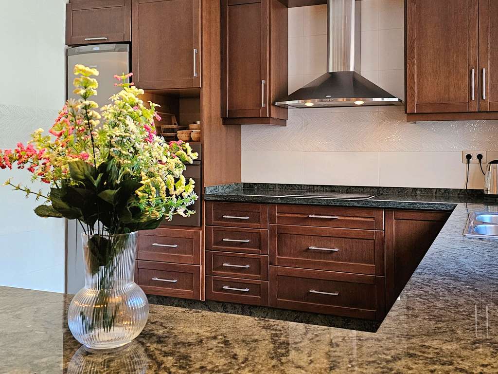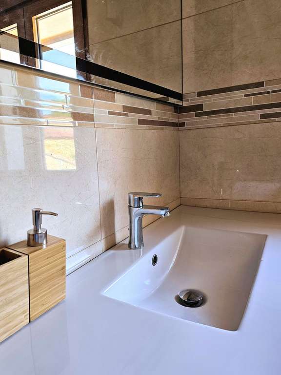 Desde el salón una escalera de mármol conduce al primer piso con una galería abierta al entrepiso. Hay otra zona de estar y de trabajo, 3 dormitorios dobles, todos con baños en suite y armarios empotrados.