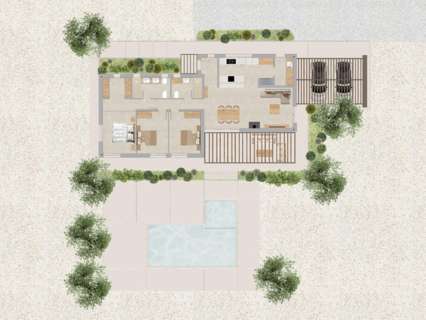 El jardín está decorado con vegetación mediterránea como olivos y cactus. La piscina en forma de L (8×4 m + 2,75×2 m de zona relax) conecta con la terraza y la zona de barbacoa opcional. También se puede incluir un garaje independiente como mejora.