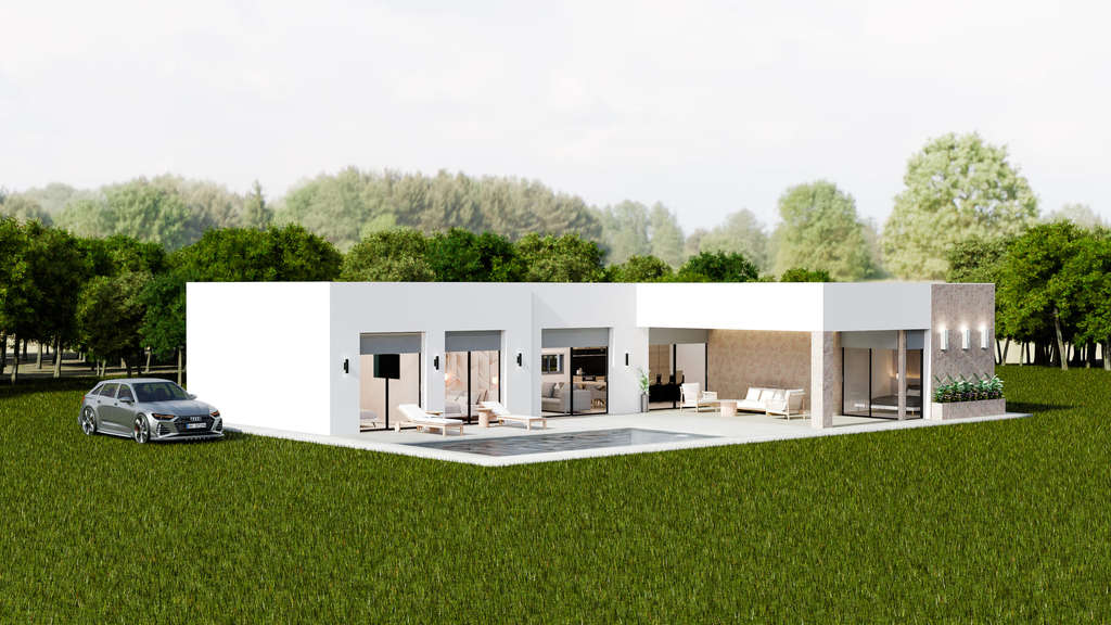 Las villas se sitúan en parcelas de 15.658 m²(no incluido), de las cuales se vallan 3.000 m² para ofrecer un entorno privado y de fácil mantenimiento. Los exteriores destacan por su diseño moderno y funcional, con una puerta corredera motorizada que facilita el acceso. Cada vivienda cuenta con una piscina privada, ideal para disfrutar del clima mediterráneo, y una instalación de paneles solares que asegura una alta eficiencia energética con etiqueta AA. Los espacios exteriores se completan con una superficie de grava de 1.000 m² alrededor de la casa, creando un entorno limpio y ordenado.