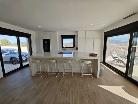 Pinoso Showstopper — new, stylish and ready to make your neighbours slightly jealousWe are delighted to present a brand-new single-storey luxury villa (finished March 2025) that manages to be both striking and sensible — a sun-soaked masterpiece set on a 10,431 m² plot with panoramic mountain views, just 8 minutes from Pinoso. If you’re after jaw-dropping vistas, modern comfort and an outdoor life that rivals any holiday brochure, this is it.Why you’ll fall in love (and stay in love)Contemporary curb appeal: Crisp white façades, matte-black roof tiles and sleek black window frames — minimal fuss, maximum impact. It looks expensive because it is.Spacious living, drenched in light: An open-plan lounge and dining area framed by large windows so the view does the heavy lifting. Add a wood-burning stove for atmosphere and the occasional dramatic fire-side toast.Kitchen goals: Designer kitchen with cooking island and unbroken countryside views — excellent for serious cooks, amateur chefs, and anyone who likes to pretend they know what sous-vide means.Bedrooms that behave: Three double bedrooms, each with a luxurious en-suite (one with a bath for those who insist on soaking away the world). Two bedrooms feature roomy walk-in wardrobes; the third has a smart built-in. Plus an extra room currently used as an office — easily converted into a guest room or snooze nook.Practical comforts: Air conditioning and heating, electric boiler plus thermal solar boiler (and prepped for panels) — comfortable year-round with an eco-friendly nudge. Utility room for washer/dryer keeps laundry out of sight and out of mind.Outdoor life — done properlyPrivate pool: 9.5 x 4 m pool with stylish outdoor shower and WC — perfect for laps, lazing, or claiming the title of “most enviable BBQ host.”Generous plot: 11,736 m² total with 3,000 m² already fenced for privacy, pets and planting ambitions. The remainder offers space to expand, grow, or simply admire.Panoramic serenity: Uninterrupted mountain views that turn everyday coffee into a cinematic moment.Practical plusesNew build — move-in ready with high-quality finishes throughout.Single-storey layout — modern, accessible living without the stairs.Energy-conscious setup — prepared for solar panels, thermal solar boiler included.Close to Pinoso — rural tranquility with town conveniences just minutes away.Bottom line A refined, contemporary villa that balances elegant design, practical luxury and irresistible outdoor living. It’s the kind of home that makes guests linger, friends visit more often, and you seriously consider staying in Spain for longer than you planned.Contact us today to arrange a viewing. Bring sunglasses — and maybe a spare pair for anyone who hasn’t yet seen the view.