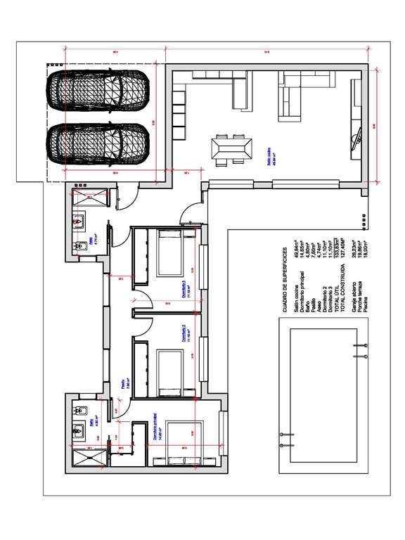 La villa se distribuye en una sola planta y cuenta con 3 dormitorios y 2 baños, uno de ellos en suite. La distribución diáfana sigue un diseño en forma de L, separando la zona de estar de los dormitorios para mayor comodidad y privacidad. La zona de día cuenta con techos altos que realzan la sensación de espacio e inundan el interior de luz natural.
