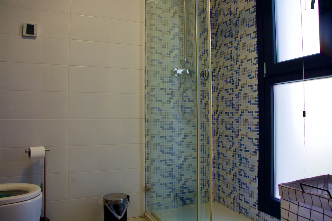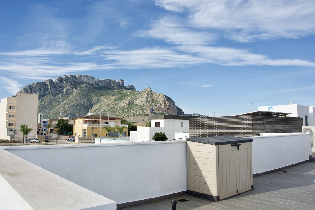 La villa dispone además de una terraza superior con vistas al paisaje montañoso, donde se encuentran instaladas las placas solares y el sistema de agua caliente. Su diseño sostenible garantiza un consumo energético mínimo: cuenta con certificación energética letra A, sistema de placas solares, reserva de 3.600 litros de agua de lluvia para riego y suelo radiante en toda la casa con calefacción de agua de 500 litros e para el sistema de ducha de 300 litros.