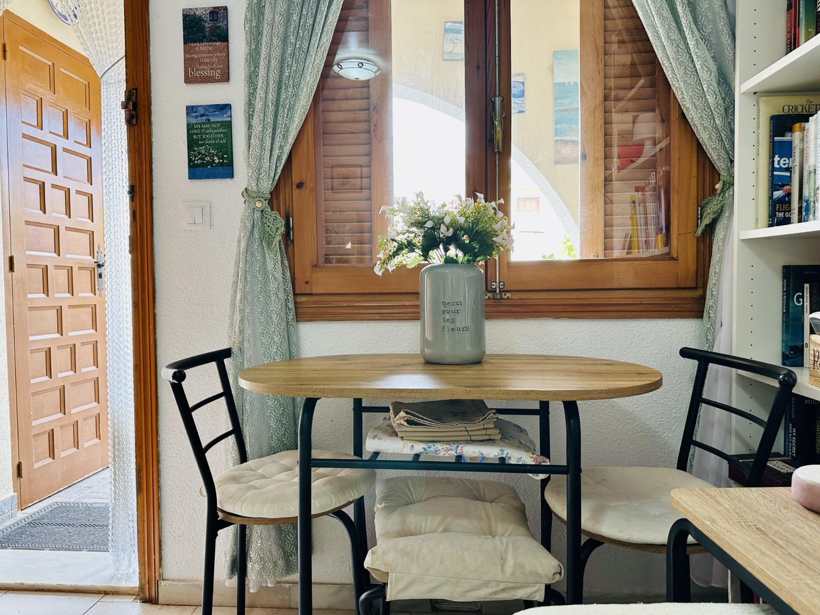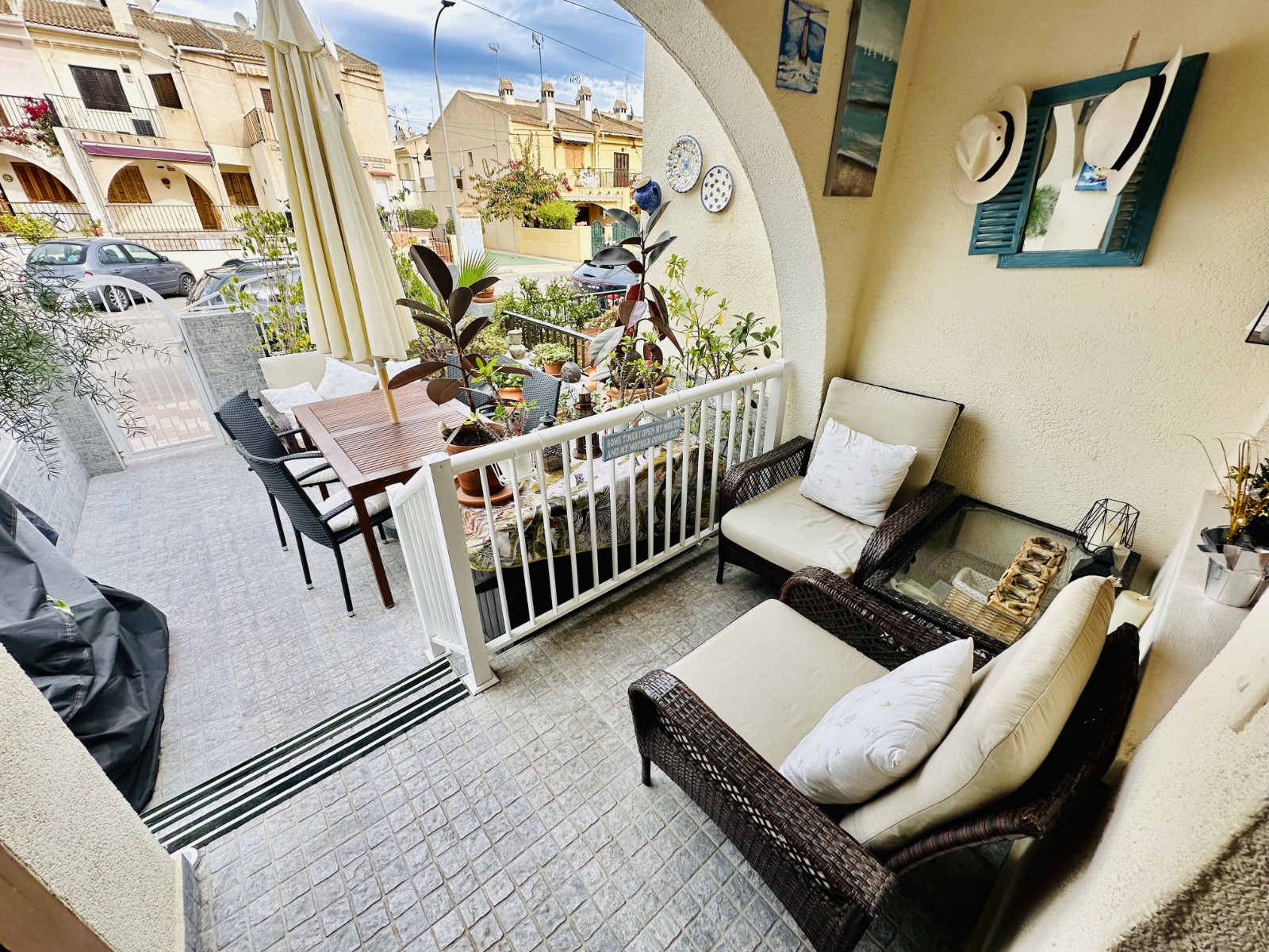 Smart Properties se complace en ofrecer esta encantadora casa de un dormitorio en venta en la hermosa urbanización de Buenavista, Guardamar, a solo 600 metros de la playa. La casa tiene una superficie construida de unos 53 m² y en la planta baja encontrará una terraza, un porche con trastero, un salón con chimenea y una cocina americana. La escalera de mármol conduce a la planta superior, donde encontrará otro pequeño trastero, el baño familiar con ducha a ras de suelo, el dormitorio doble con armarios empotrados y puertas dobles de aluminio nuevas con persianas de aluminio que dan a un balcón con vistas despejadas. Hay aire acondicionado frío-calor en el salón y el dormitorio.
