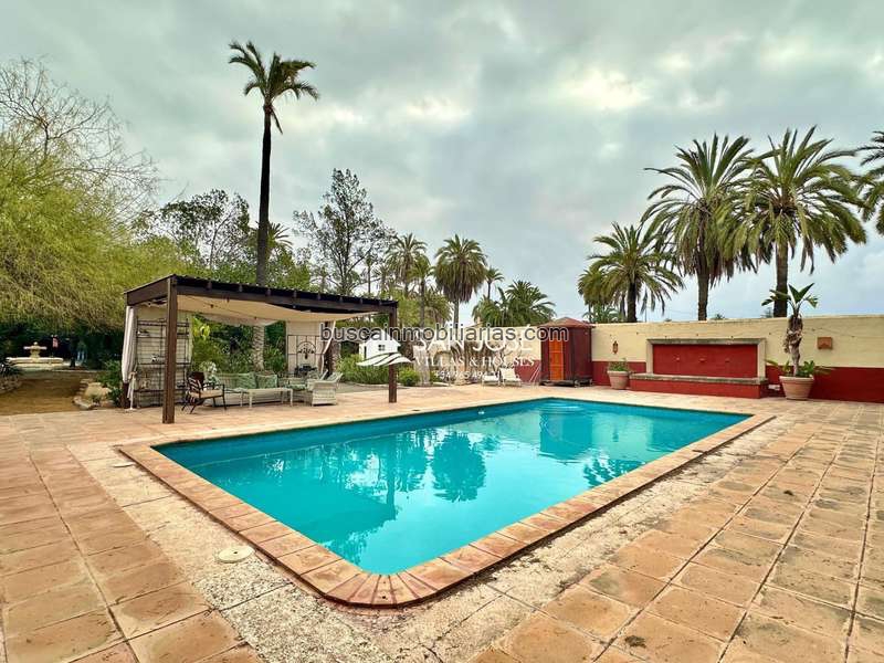 chalet de 840 m2 construidos en varias edificaciones en parcela vallada de 8500 m2 con puertas automáticas, muy cerca de Elche y con buena ubicación y buenos accesos.