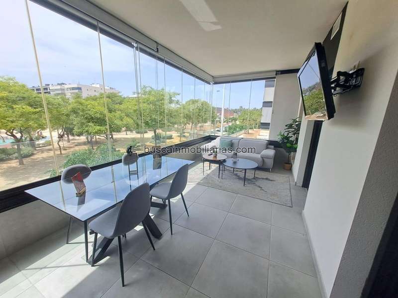 La vivienda consta de 3 Habitaciones y 2 Baños completos con cocina integrada en el salón desde el cual se accede a una terraza de 21 metros en la que se puede disfrutar de un espacio adicional y acogedor totalmente acristalado y con salida de aire acondicionado. Tiene otra terraza que se puede convertir en otro dormitorio, actualmente está como terraza de verano con salida directa a una de las piscinas de la comunidad. La vivienda incluye en el precio garaje y trastero.