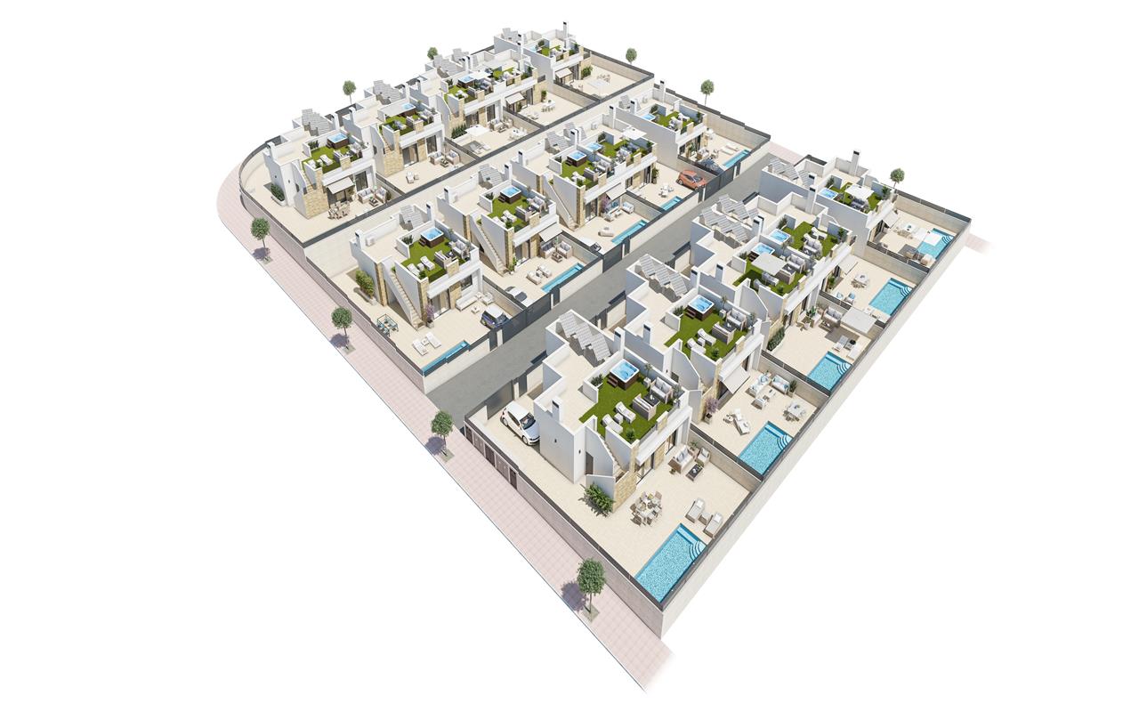 El precio incluye: piscina privada, solárium, 1,5 kW de energía gratuita, 3 paneles fotovoltaicos en el solárium, aire acondicionado, baños completos, jardín terminado, solárium con césped artificial y una zona reforzada para jacuzzi si el cliente lo desea. Ósmosis en la cocina, sistema de ventilación automática, aparcamiento privado, lavadero exterior, caldera de aerotermia de 150 litros y mucho más.