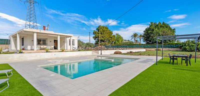 Bienvenido a esta espaciosa villa en una parcela rústica de 3.500 m², con una ubicación privilegiada en Elche, a solo 5 minutos del centro comercial L'Aljub y a 1 minuto de la autopista. La casa es de una sola planta y consta de 3 dormitorios, 2 baños, una amplia cocina y un salón con chimenea. Fue reformada hace cuatro años. En el exterior, podrá disfrutar de una bonita terraza, un amplio jardín y una piscina a estrenar de 10x8 metros. Aquí también encontrará una barbacoa en construcción y un aseo independiente. La propiedad cuenta con agua de riego con sistema de filtrado para uso doméstico, electricidad legal, pozo propio y fosa séptica. La casa perfecta para quienes buscan una propiedad espaciosa y privada, pero que a la vez deseen estar cerca de tiendas y otros servicios. Contáctenos para más información o para concertar una visita.