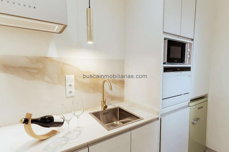 microondas, freidora de aire, cocina de inducción, menaje completo, y elegante campana extractora de alto rendimiento, dos amplios armarios empotrados, escritorio, mesa extensible de hasta 4 comensales (dos sillas y dos taburetes), cama de 135 cm con excelente colchón.