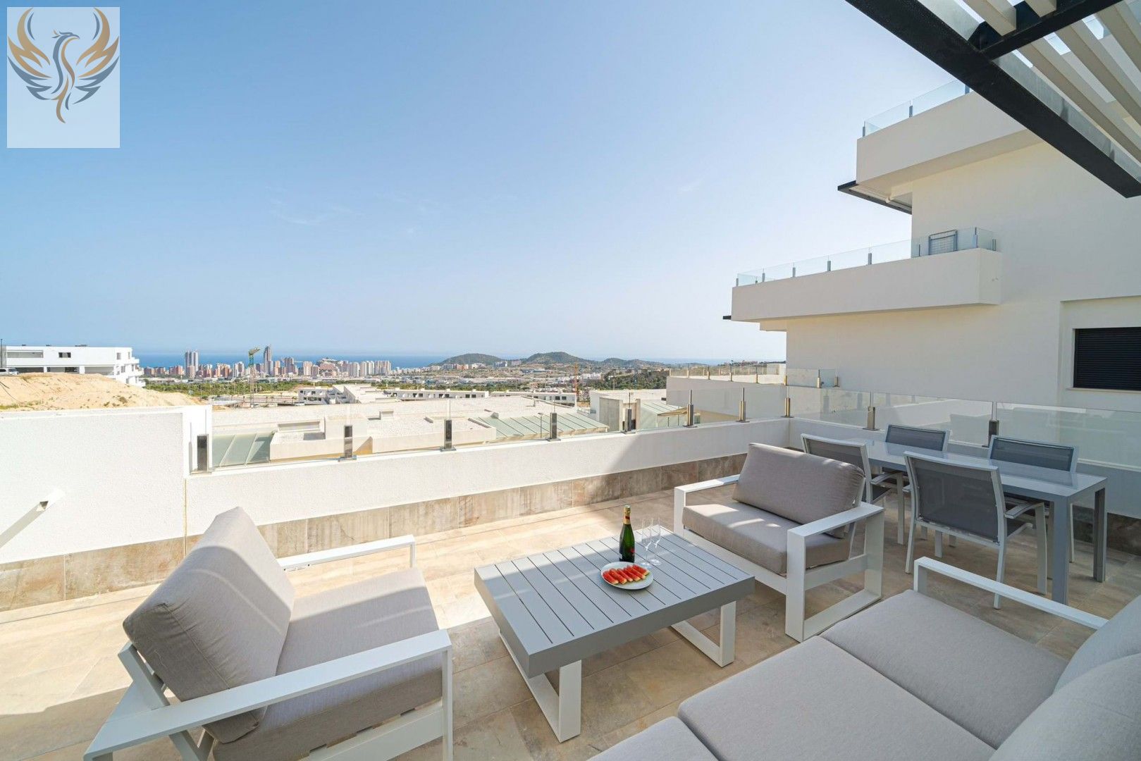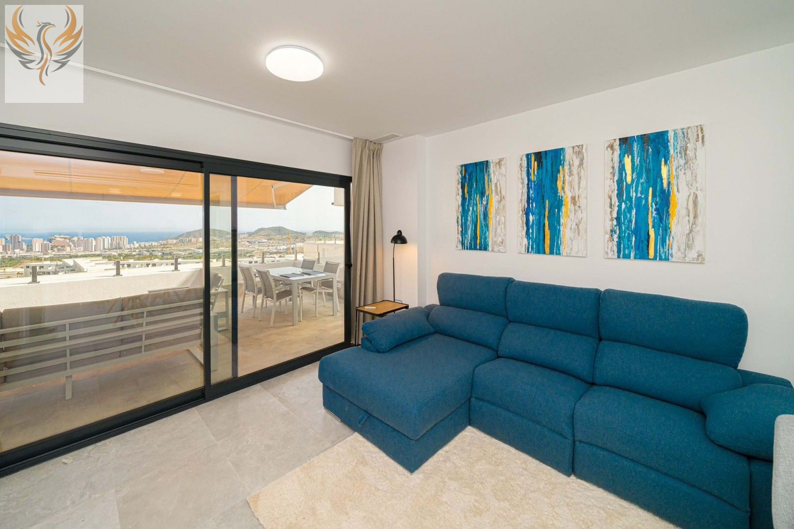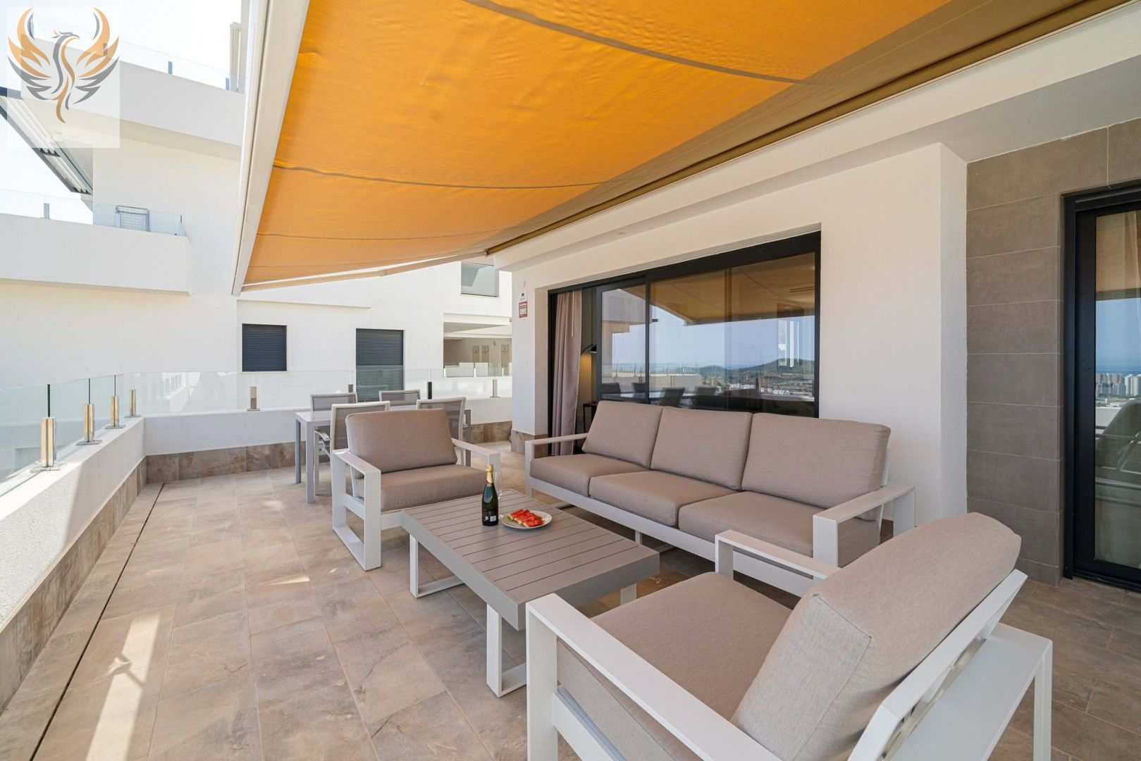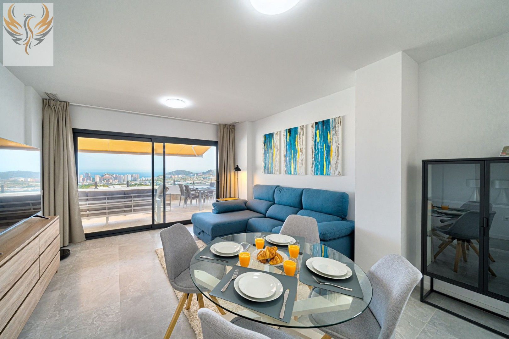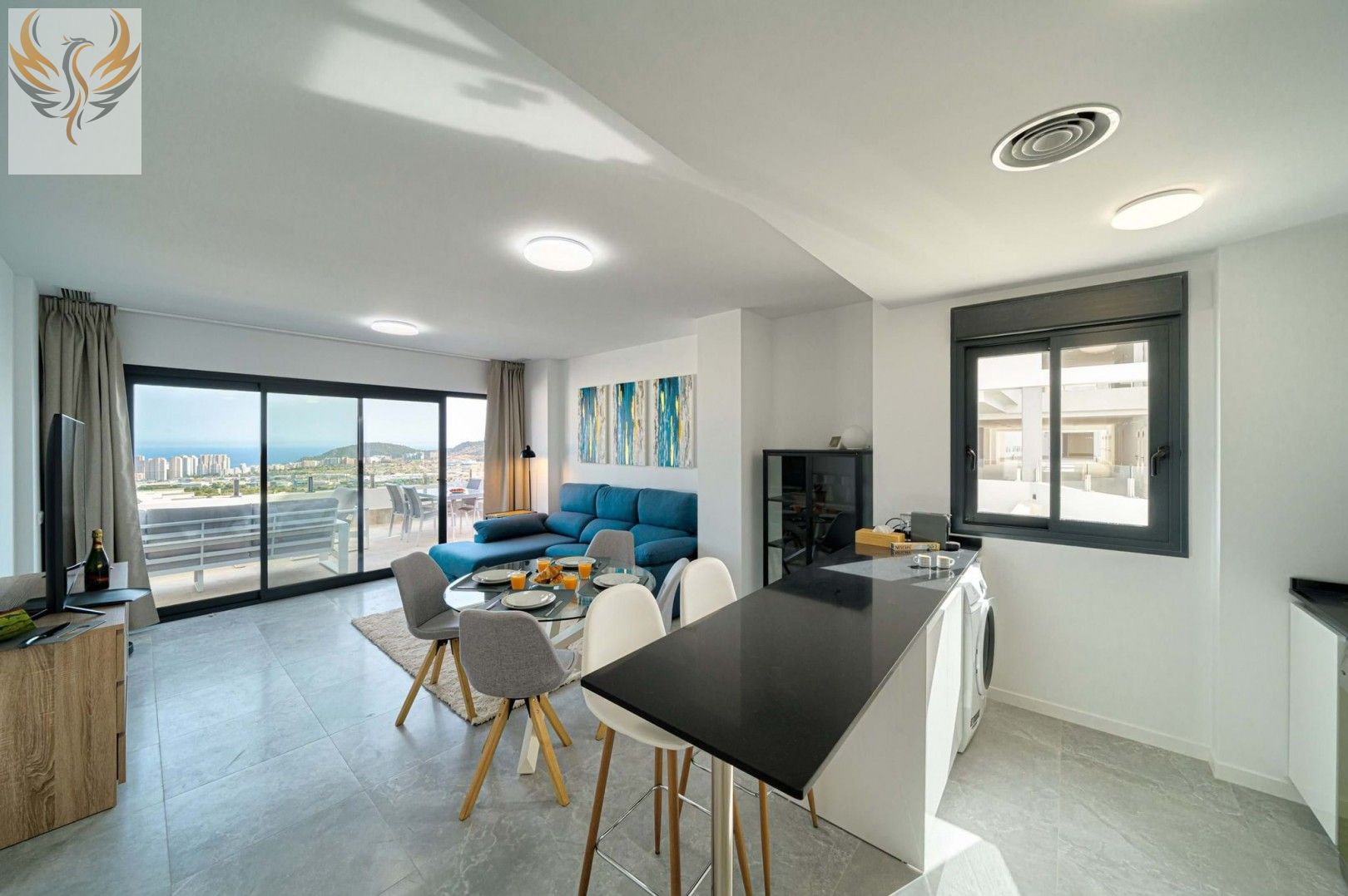 El apartamento cuenta con una espaciosa terraza orientada al sur (44 m2) con vistas a la piscina, el mar y Benidorm. Dispone de dos dormitorios, dos baños, una moderna y lujosa cocina abierta con barra de desayuno, lavadora, lavavajillas y una nevera grande con congelador independiente. Además, debajo del complejo se encuentra un garaje cerrado con su propia plaza de aparcamiento.