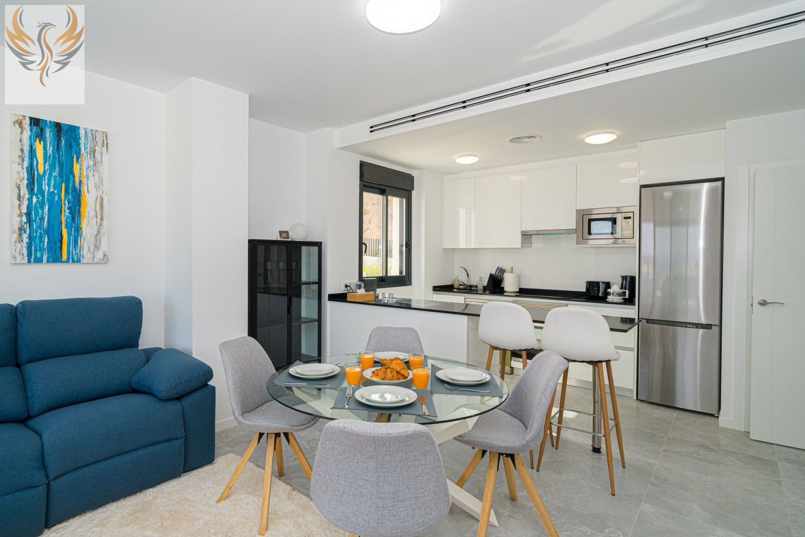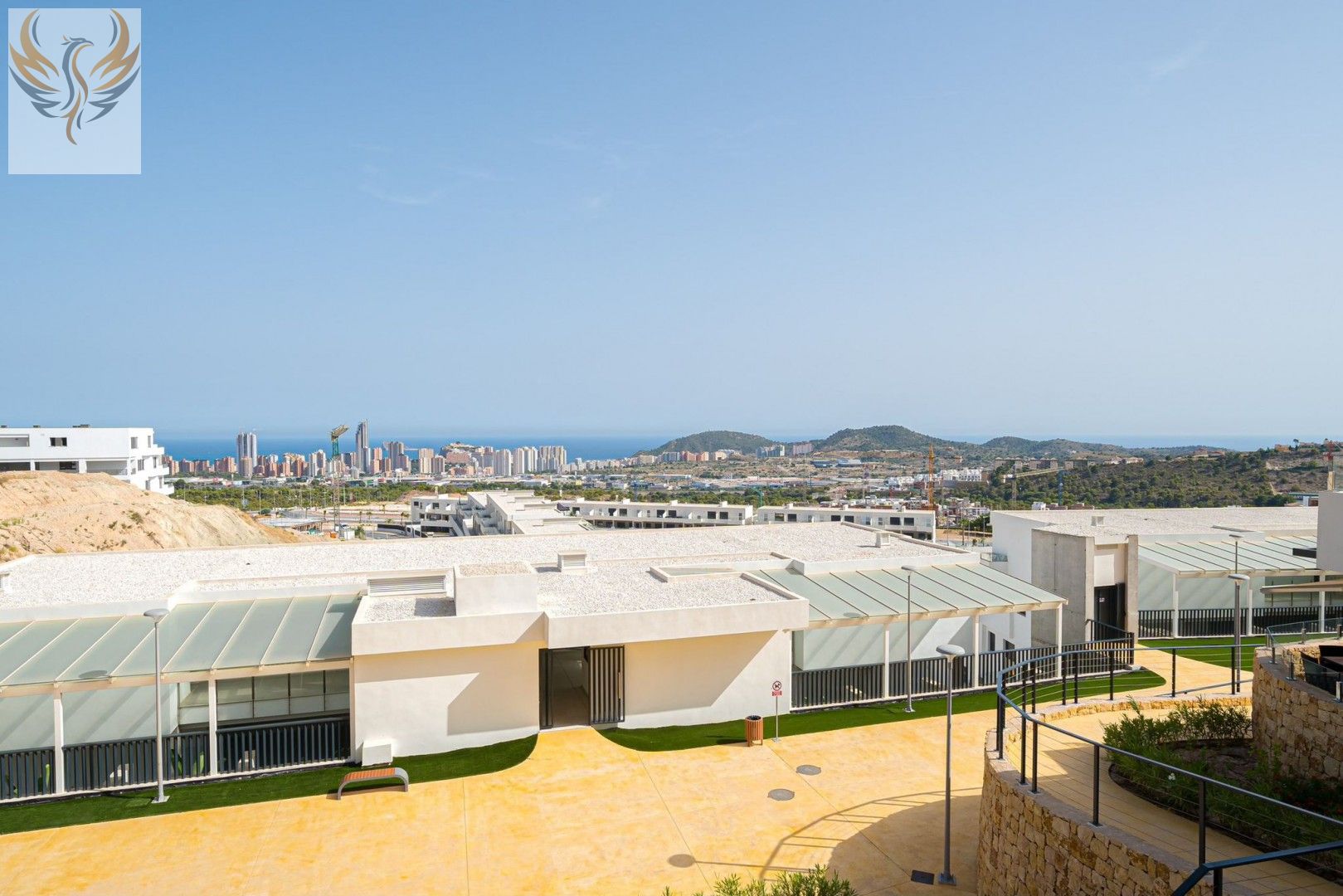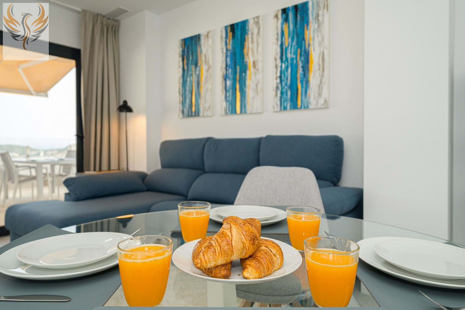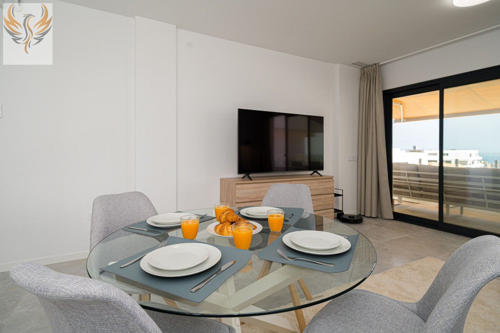 El apartamento cuenta con una espaciosa terraza orientada al sur (44 m2) con vistas a la piscina, el mar y Benidorm. Dispone de dos dormitorios, dos baños, una moderna y lujosa cocina abierta con barra de desayuno, lavadora, lavavajillas y una nevera grande con congelador independiente. Además, debajo del complejo se encuentra un garaje cerrado con su propia plaza de aparcamiento.
