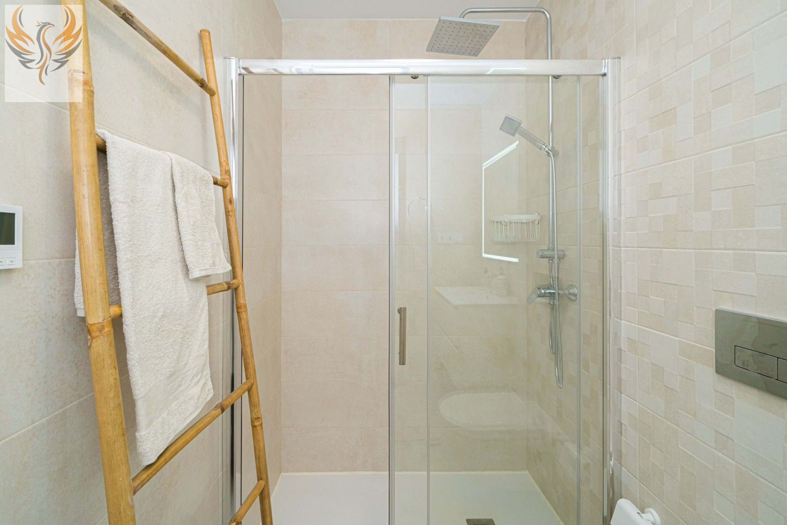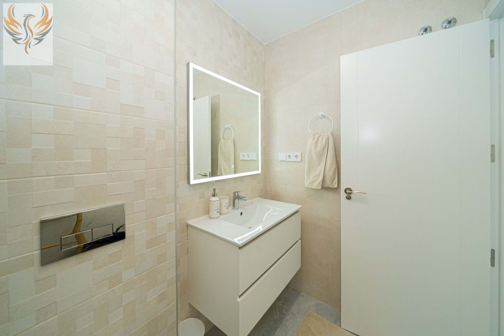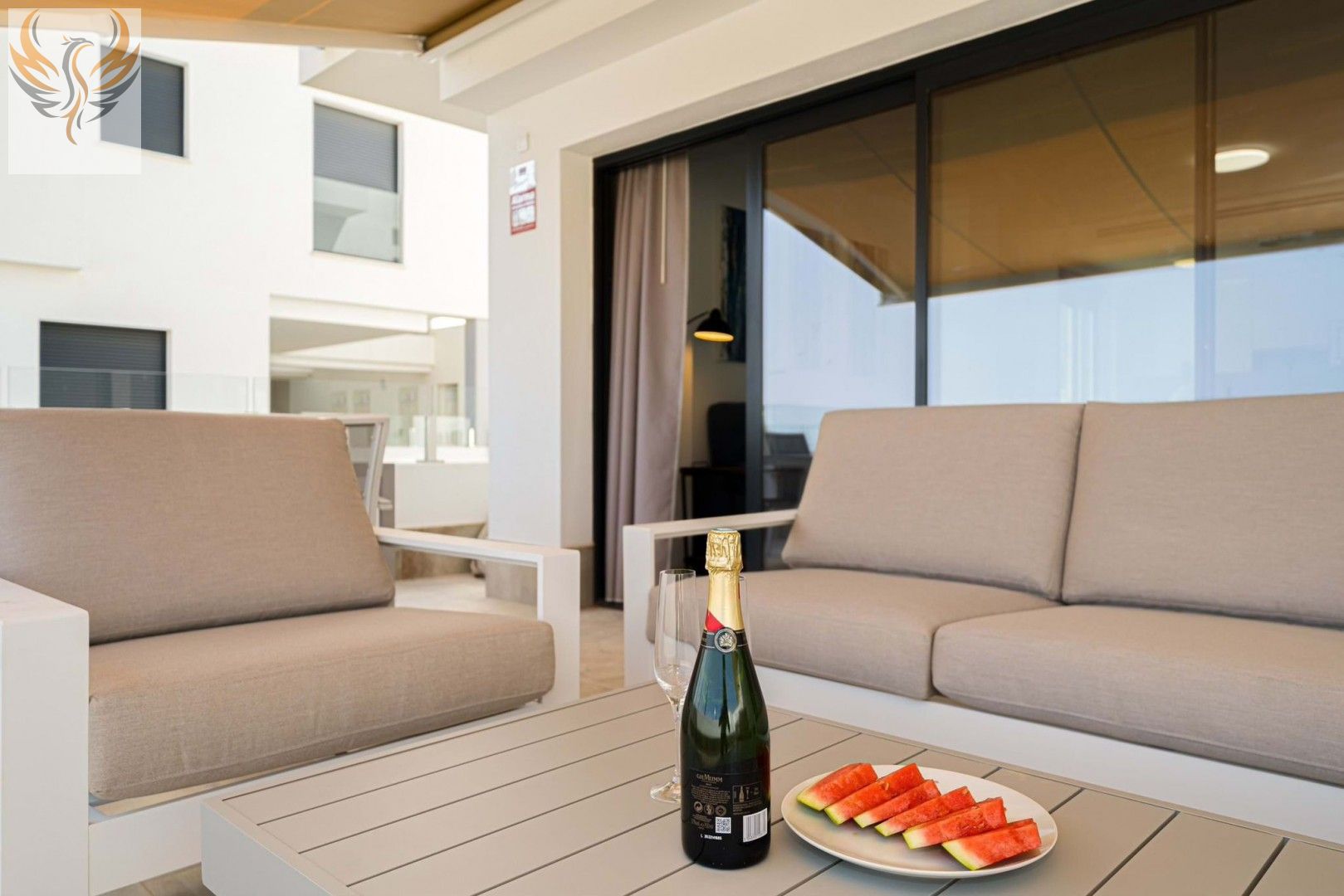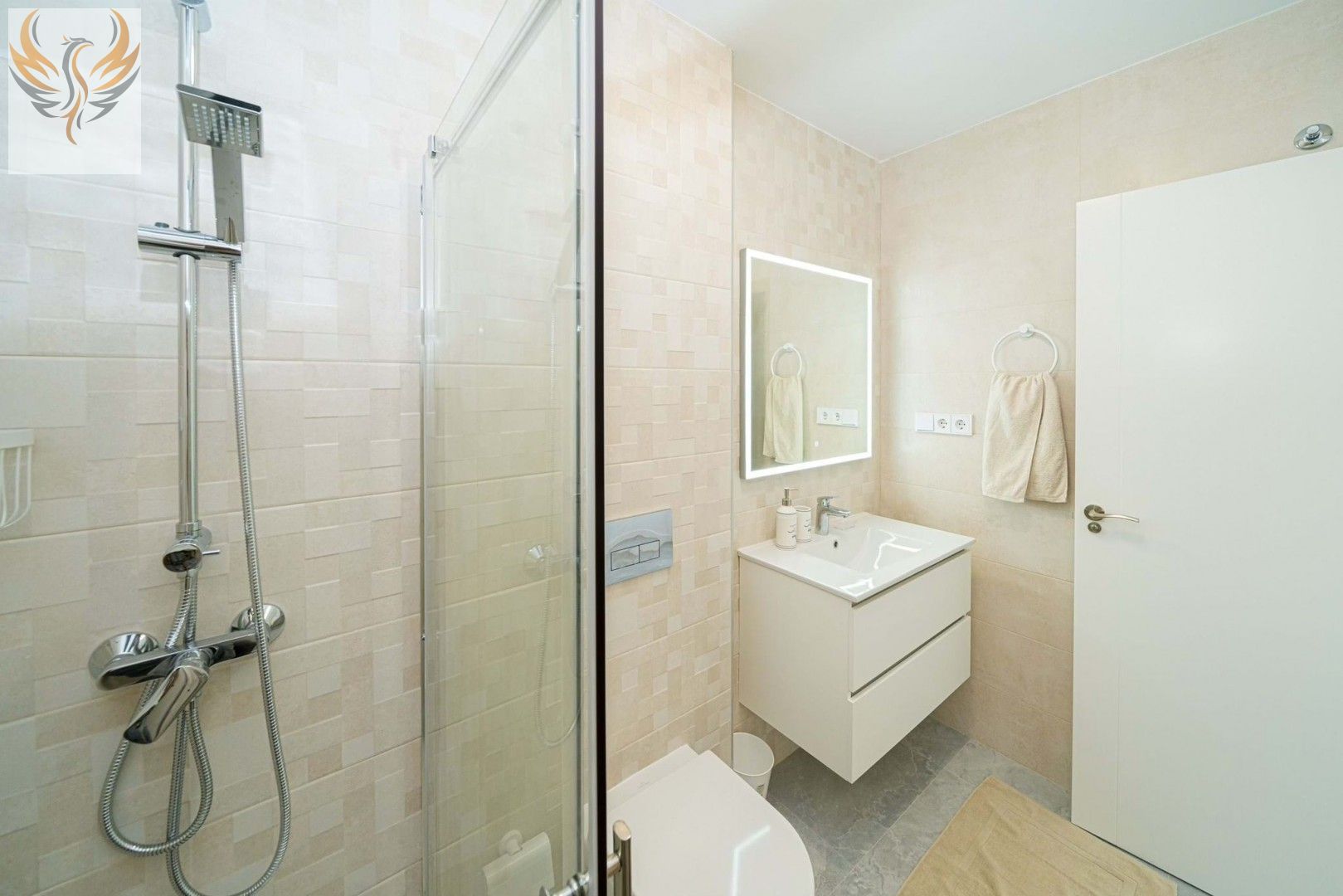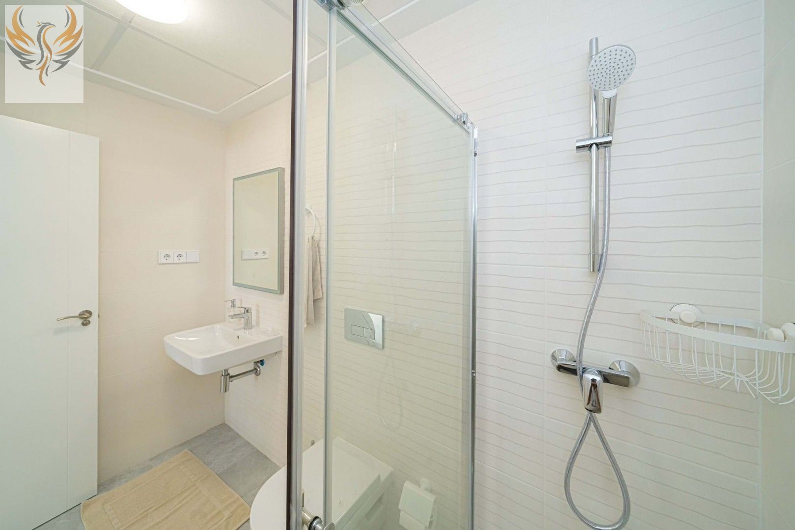 El apartamento cuenta con una espaciosa terraza orientada al sur (44 m2) con vistas a la piscina, el mar y Benidorm. Dispone de dos dormitorios, dos baños, una moderna y lujosa cocina abierta con barra de desayuno, lavadora, lavavajillas y una nevera grande con congelador independiente. Además, debajo del complejo se encuentra un garaje cerrado con su propia plaza de aparcamiento.