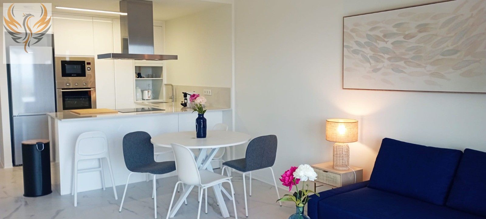 Precioso Apartamento con Solarium. Moderno en Zona exclusiva de la Costa Blanca. Dos Dormitorios y Dos Baños Completos. Totalmente Nuevo. Cocina totalmente equipada y Terraza Exterior.