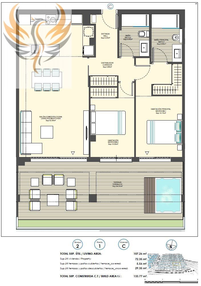 Las viviendas han sido dotadas con grandes terrazas que asoman al Mediterráneo y amplios ventanales, que conectan las zonas exteriores con las interiores, obteniendo como resultado estancias muy espaciosas y con mucha luz natural. En la terraza destaca una moderna celosía que tamiza los rayos del sol.