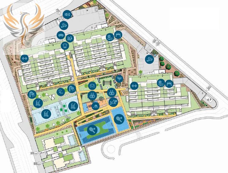 En el centro destaca una impresionante piscina comunitaria y un jacuzzi, una refrescante zona de chapoteo para niños y una pista polideportiva. Las zonas comunes se completan con una pista de pádel, parque infantil, zona de ejercicios biosaludables, gimnasios, áreas ajardinadas para pasear, gimnasio canino, estancias de recreo, salas coworking, sala gourmet, mirador y piscina climatizada.