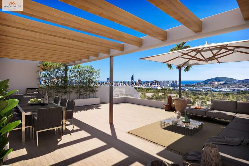 Marco Villas presenta este exclusivo complejo de 66 apartamentos de 3 habitaciones y 2 baños, ubicado en una zona privilegiada de Finestrat, a pocos minutos de las playas de Benidorm. Los apartamentos cuentan con jardín privado en planta baja o solárium en primera planta, trastero y plazas de aparcamiento en el parking subterráneo.