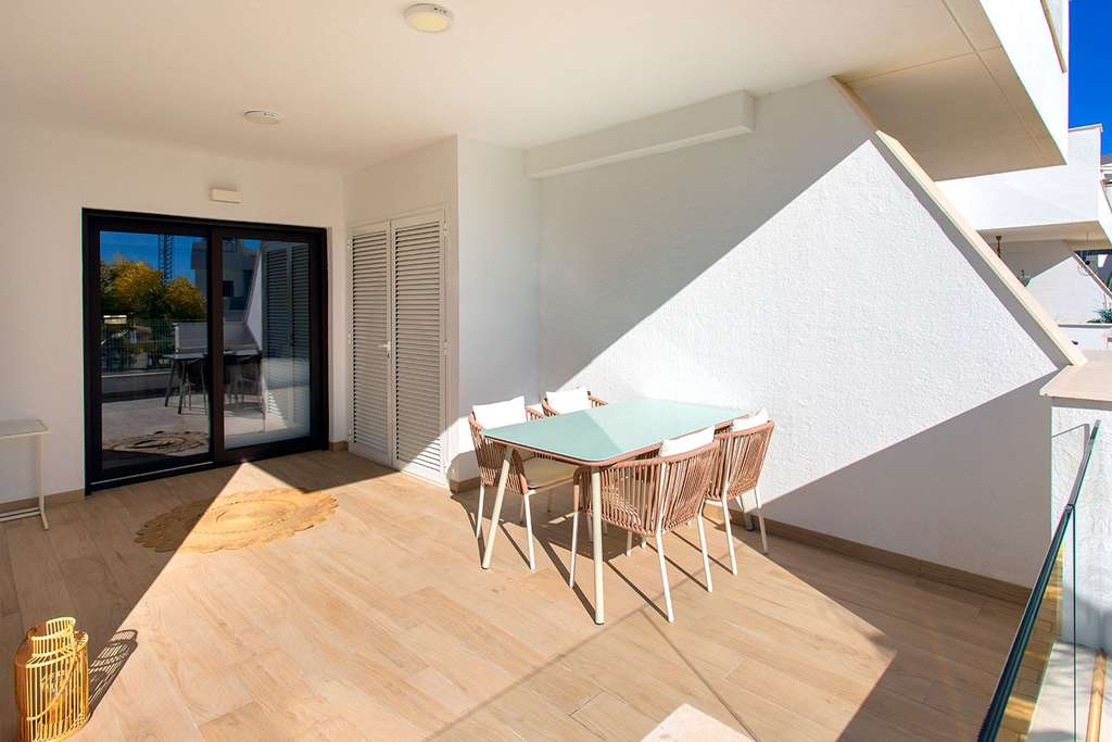 Nos complace presentar este fantástico bungalow en planta baja con dos dormitorios y dos baños (uno de ellos en suite). Los baños están equipados con suelo radiante para mayor confort. El bungalow cuenta con dos grandes terrazas (31,4 m² y 25,35 m²), una de ellas con vistas a la piscina y acceso directo a la zona comunitaria. Además, hay un garaje cubierto comunitario disponible para los residentes.