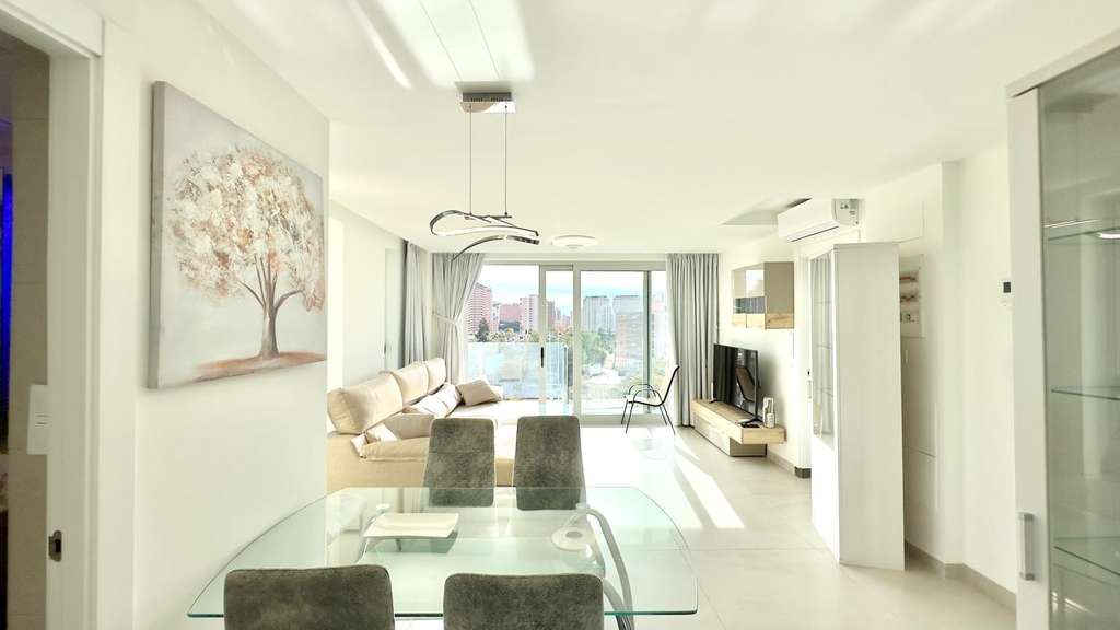 En una de las zonas más dinámicas de Benidorm se esconde un auténtico oasis privado pensado para quienes quieren disfrutar del Mediterráneo con un plus de exclusividad y tranquilidad. Al cruzar la puerta de esta urbanización, la sensación es la de entrar en un pequeño resort donde todo está preparado para desconectar: una piscina larguísima de agua azul intensa recorre el lateral del edificio y se convierte en el eje de la vida diaria, rodeada de cómodas tumbonas, sillones colgantes y rincones verdes que invitan a olvidarse del ritmo de la ciudad. La arquitectura moderna del conjunto, con grandes superficies acristaladas, barandillas de vidrio y detalles en mármol, refuerza esa sensación de lujo relajado que tanto cuesta encontrar en pleno Benidorm. La zona de piscina es, sin duda, el gran reclamo visual de la urbanización. El espejo de agua se extiende como una lámina infinita a lo largo de todo el jardín, perfecto para nadar largos, refrescarse en verano o simplemente dejarse llevar por el sonido del agua mientras se toma el sol. A su alrededor se han creado diferentes ambientes: áreas de descanso con butacas reclinables, camas acolchadas para tumbarse con un libro y, sobre todo, una serie de columpios‑sillón de estilo bohemio que cuelgan de la estructura perimetral y ofrecen un rincón íntimo desde el que contemplar la piscina. De día, el sol se refleja en el agua y llena de luz todo el espacio; al atardecer, la combinación de tonos azules, vegetación y arquitectura crea una atmósfera muy especial, ideal para compartir una copa o una cena tranquila al aire libre. La vegetación juega un papel fundamental en la personalidad de este residencial. Palmeras, plataneras y plantas tropicales abrazan todo el perímetro del jardín, aportando frescor, sombra natural y un agradable toque exótico que transporta mentalmente a un resort de vacaciones. Pasear por los senderos que rodean la piscina, sentarse bajo un árbol o balancearse en una hamaca entre la vegetación se convierte en parte de la rutina diaria. La sensación de intimidad es máxima, ya que el diseño combina zonas verdes, cerramientos y diferencias de altura que aíslan del exterior y permiten disfrutar del espacio sin miradas indiscretas, algo muy valorado en una ciudad tan viva como Benidorm. El edificio que preside la urbanización se ha diseñado con un marcado aire contemporáneo. Las fachadas en tonos claros, los detalles en mármol y las barandillas de cristal proporcionan una imagen limpia, luminosa y muy actual. Desde las terrazas se disfrutan vistas directas a la piscina y a los jardines, de manera que el azul del agua y el verde de las plantas forman parte del paisaje cotidiano desde el primer café de la mañana hasta la última luz del día. Al mismo tiempo, la ubicación permite contemplar el skyline de Benidorm y las montañas del entorno, una combinación que refuerza la sensación de estar en un enclave único: cercano a todo, pero con un ambiente mucho más sereno que el del centro. En el interior del residencial, la experiencia continúa con una zona de spa que sorprende por su cuidado diseño. El circuito de aguas climatizadas incluye diferentes zonas de hidromasaje, chorros a presión y áreas de relax, todo ello revestido con mosaicos y cerámicas de inspiración marmoleada que transmiten elegancia y bienestar. Aquí es posible disfrutar de un auténtico momento de desconexión en cualquier época del año: una sesión de burbujas tras un día de playa, un rato de agua caliente en invierno o una tarde de relax mientras fuera sopla el viento. El spa se complementa con un ambiente envolvente, iluminación indirecta y una estética muy trabajada que convierte cada visita en un pequeño ritual de autocuidado. La urbanización incorpora también espacios pensados para mantener un estilo de vida activo sin salir de casa. Una zona equipada con máquina multifunción permite realizar entrenamientos de fuerza y tonificar el cuerpo sin necesidad de desplazarse a un gimnasio externo.