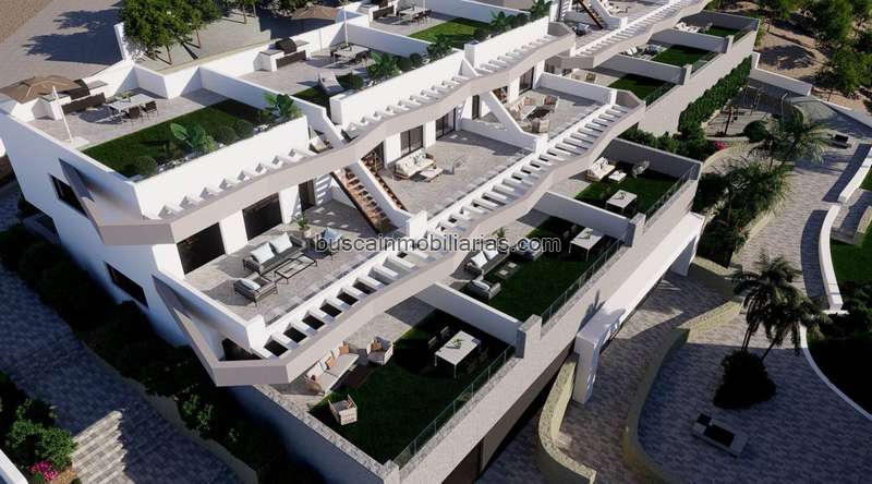 Bungalows en planta alta con solarium privado y bungalows en planta baja con jardín privado y posibilidad de piscina privada con coste adicional.