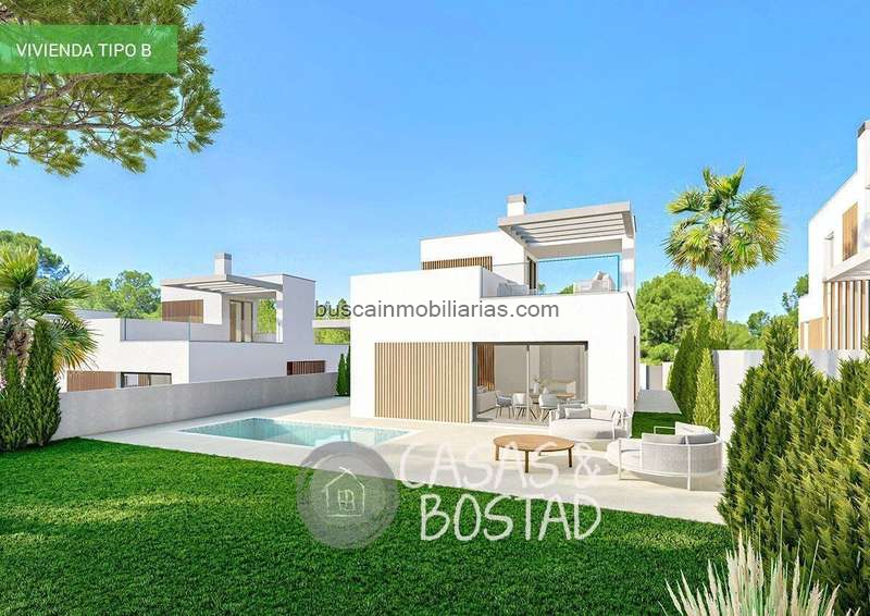 Todas las villas tienen 3 dormitorios, 2 o 3 baños, cocina americana con salón, armarios empotrados, aire acondicionado y aerotermia, cocina equipada, jardín privado con piscina y parking.