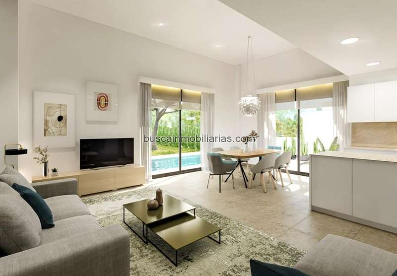 Todas las villas tienen 3 dormitorios, 2 o 3 baños, cocina americana con salón, armarios empotrados, aire acondicionado y aerotermia, cocina equipada, jardín privado con piscina y parking.