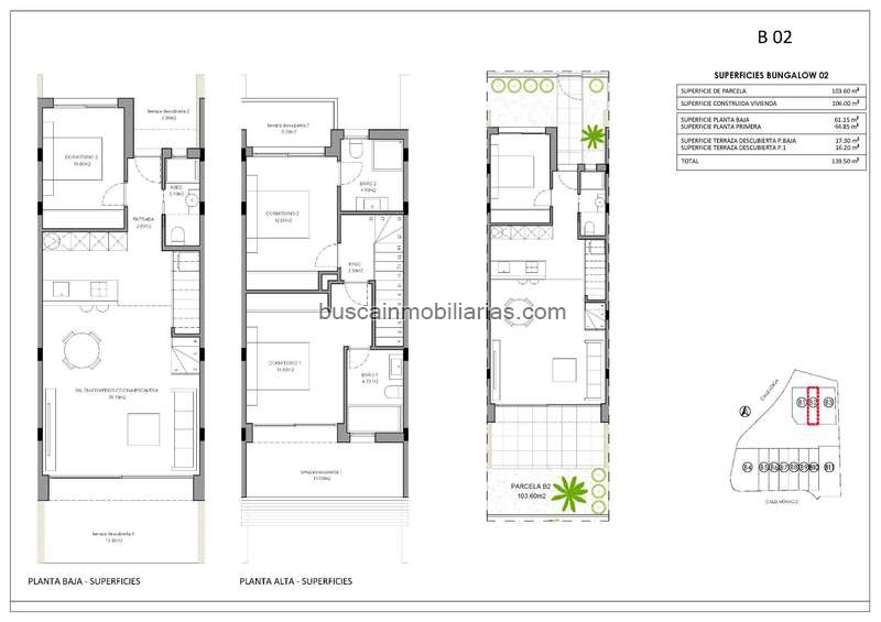 Las viviendas se distribuyen en dos plantas y cuentan con una superficie construida aproximada de 106 m², sobre parcelas privadas de alrededor de 119 m², además de terrazas descubiertas en ambas plantas.