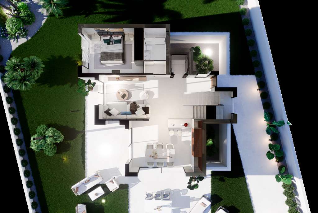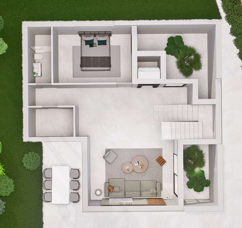 Las villas cuentan con salas de estar amplias y luminosas y cocinas de diseño modernas. Las cocinas están totalmente equipadas con materiales de alta calidad, como encimeras de Silestone o materiales similares, y tienen un aspecto elegante. Además, estas villas disponen de 3 a 4 dormitorios, según el tipo. Todos los dormitorios tienen armarios empotrados totalmente acabados con textiles en el interior y ofrecen un generoso espacio de almacenamiento. Las habitaciones rezuman lujo y confort y están diseñadas para un bienestar óptimo con mucha luz natural y acceso directo a terrazas privadas.