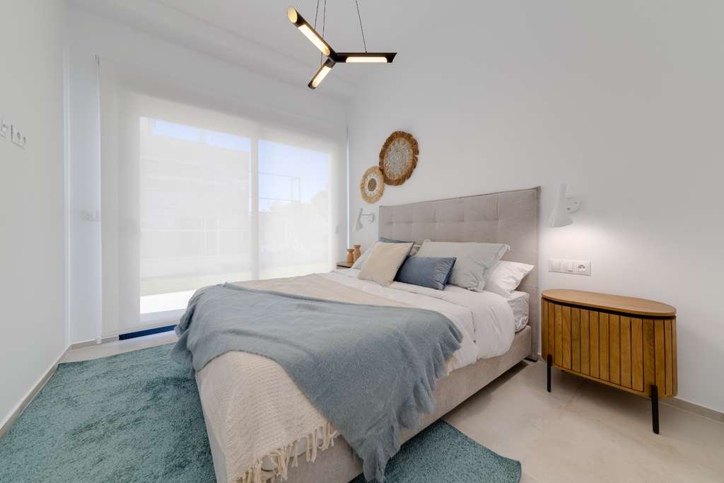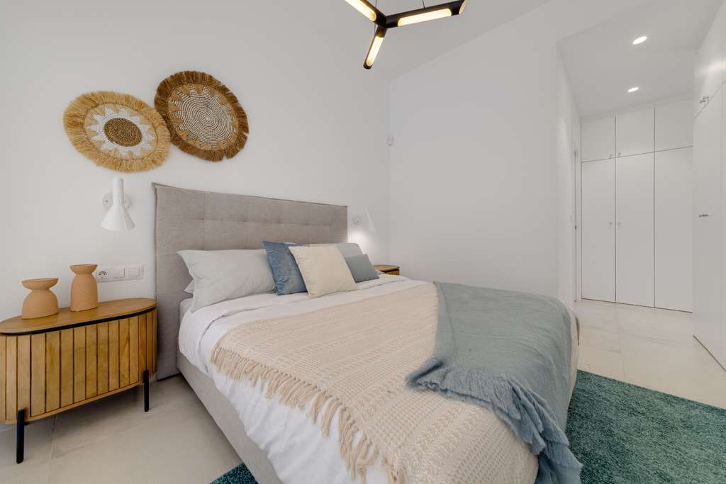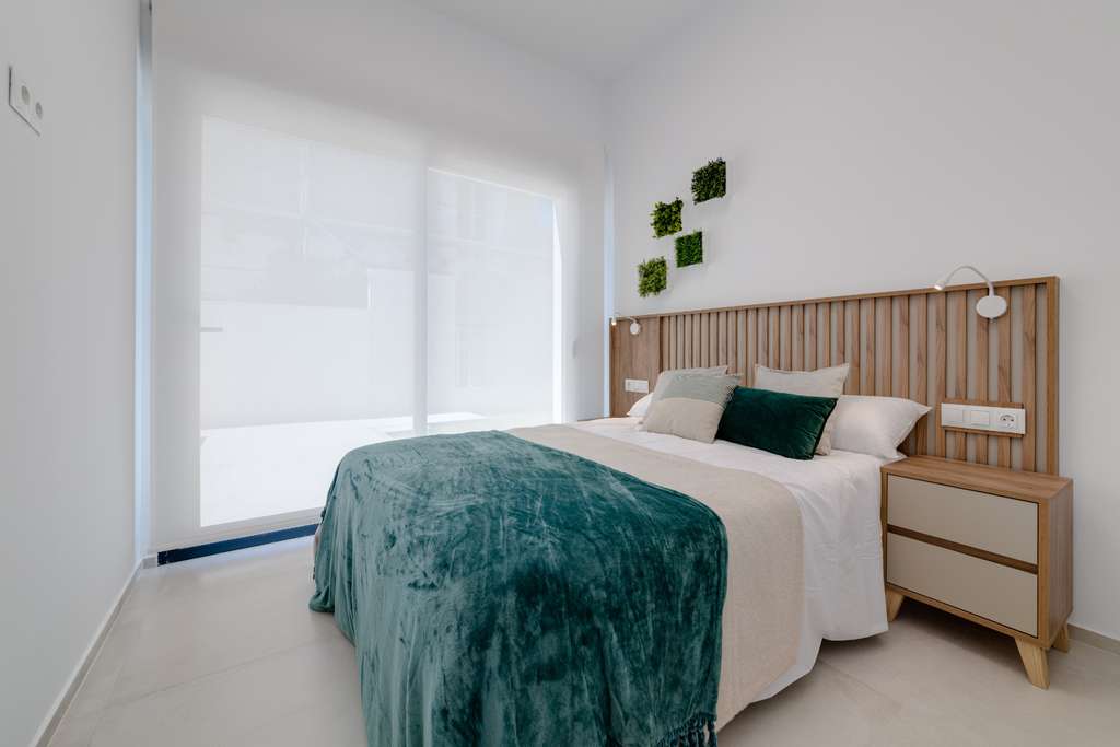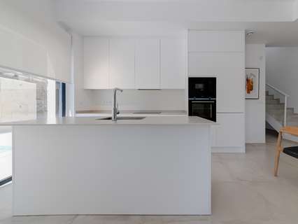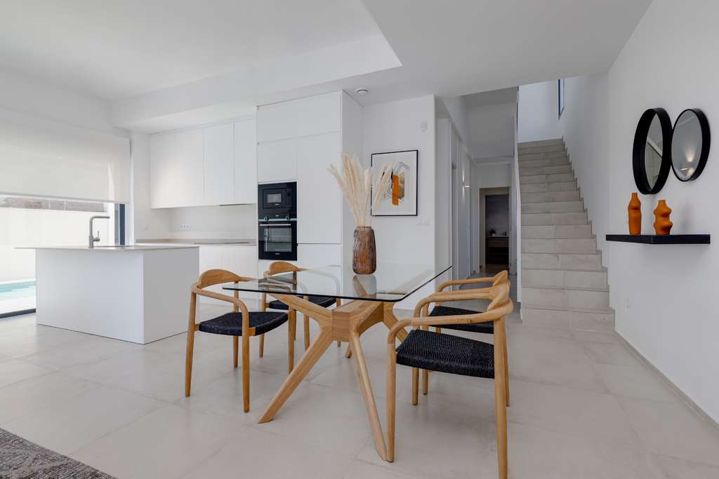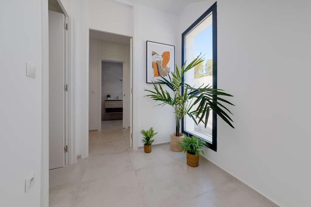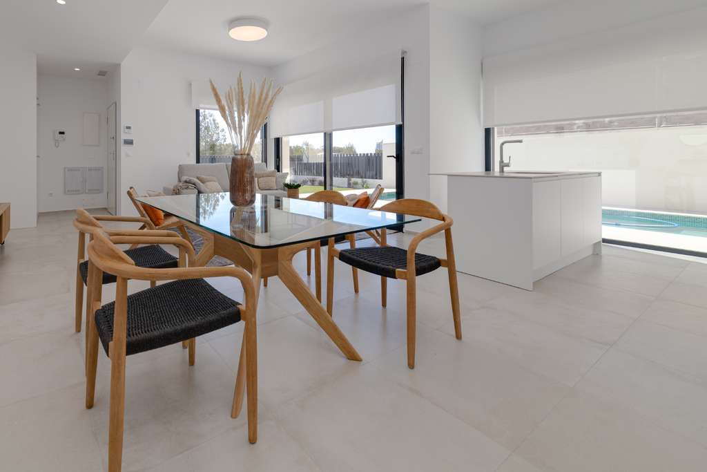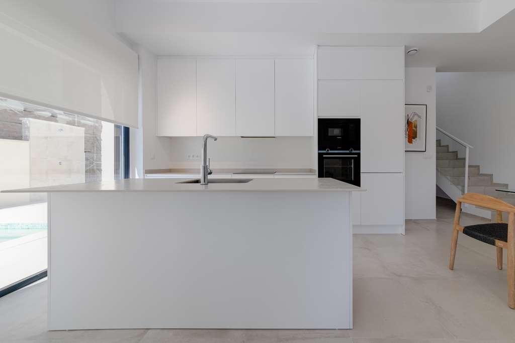 Fachada: Revestimiento exterior tipo SATE en blanco con acabados de piedra, aislamiento térmico con lana mineral, garantizando eficiencia energética.Cubierta y exteriores: Cubiertas transitables en solarium con gres antideslizante, no transitables en zonas de torreón con grava.Carpintería Interior: Puerta principal acorazada y lacada en blanco, armarios modulares con puertas en blanco a juego, y pernos de acero inoxidable.Pavimentos y Revestimientos: Suelo de gres porcelánico en toda la vivienda (60x60 cm), alicatado en baños hasta el techo y techos falsos de yeso laminado en zonas húmedas.Cocina y Baños: Cocina equipada con placa de inducción, campana extractora y electrodomésticos integrados. Baños con lavabos de porcelana, duchas de resina y grifería monomando de alta calidad.Climatización y Energía: Aire acondicionado por conductos y agua caliente mediante sistema de aerotermia, con ventilación mecánica controlada de doble flujo.Domótica y Seguridad: Preinstalación de alarma, control domótico de temperatura, persianas motorizadas, videollamada y sensores de seguridad.Piscina y Jardín: Piscina privada iluminada con proyectores LED, césped natural, ducha exterior y caseta técnica para depuración automática.Sostenibilidad: Posibilidad de instalación de paneles solares fotovoltaicos con inversor híbrido para conexión a red.