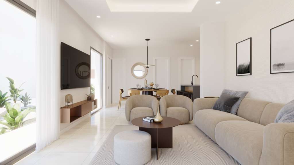 Salón-comedor-cocina diáfana (34,30 m²) Dormitorio principal (13,50 m²) lleno de luz natural Dos dormitorios adicionales (11,35 m² y 11,74 m²) Dos baños (3,50 m² y 4,30 m²) Terraza cubierta (12,10 m²) perfecta para relajarse al aire libre. Superficie total construida: 109,80 m²
