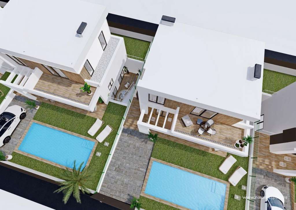 Los chalets se distribuyen en 2 plantas y disponen de 3 dormitorios, 3 baños, cocina americana con salón, armarios empotrados, cocina equipada, jardín privado con piscina y parking.